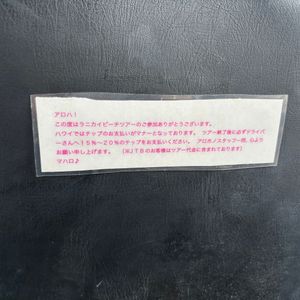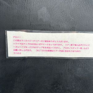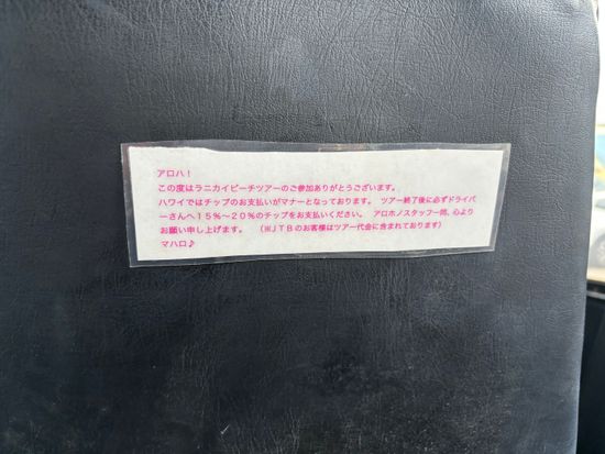 ラニカイに送迎と、自転車を借りるだけの金額です。地図の配布もありません。確実スマホで地図の写真をとり終了、簡単な説明のみです。ガイドもなく各自で目的地までいきます。それに対して送迎バスの座席にこの張り紙はひどいかなと思います。写真を撮ってくれたり『ツアーらしいこと』をしてくださるのであれば話は違いますが、ただの送迎です。検討したほうがいいですよ!