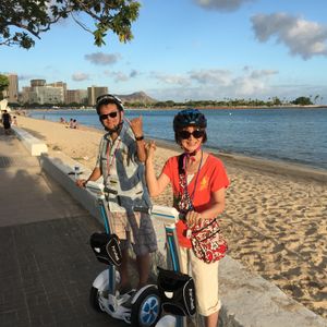 セグウェイにハワイで乗れると申し込みました。集団でゾロゾロと走行するのかなと思っていたら、当日は私たち二人だけの参加となりマンツーマンで教えていただけたり、写真やビデオを専属で撮っていただけたりしました。また、街中でも要所要所で安全配慮していただき、衝突や転倒などもなく、運河沿いやアラモアナ海岸をスイスイとお散歩できました。天候にも恵まれ、ダイヤモンドヘッドやワイキキの街を背景に撮っていただいた写真は何よりのお土産になりました。