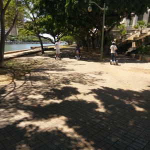 少し説明を受けた後、みんな スグに乗れるようになりました!アラモアナ公園に行くまでの歩道は、ちょっと狭くて緊張しましたが、公園に着く頃には、スイスイ走れました。