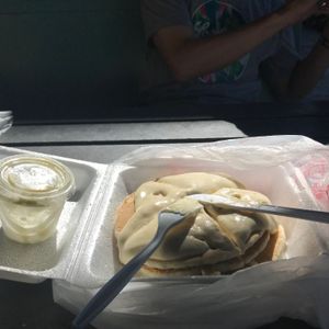 書かれているようにドライバーさんが前もって注文を取ってくれるので無駄な待ち時間なく食べられます。近くのロングスドラッグスでビールを買い、持ち込みを教えてもらったので、おすすめのスパイシーガーリックシュリンプにぴったりでした。