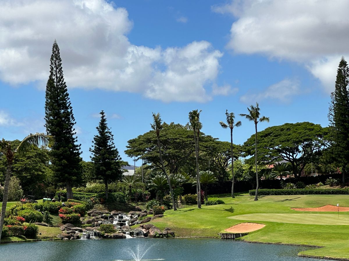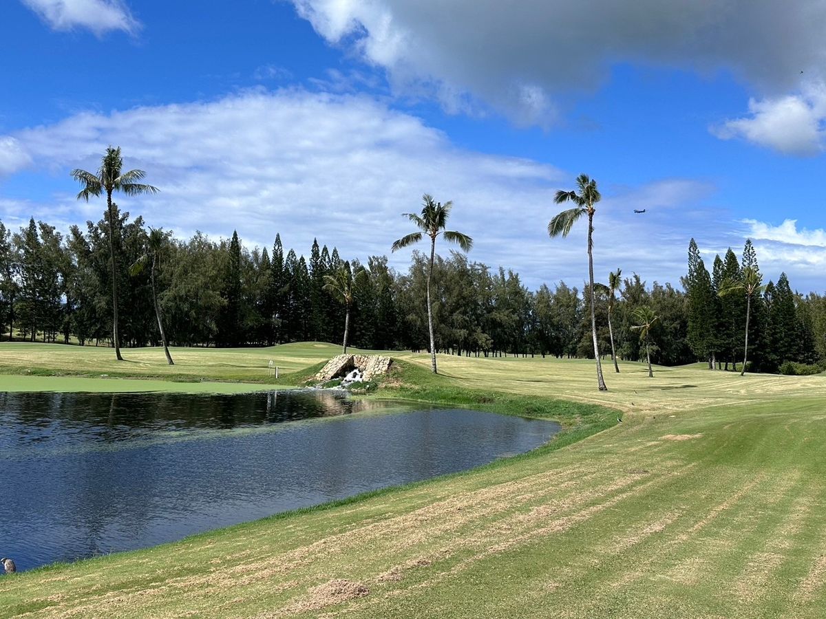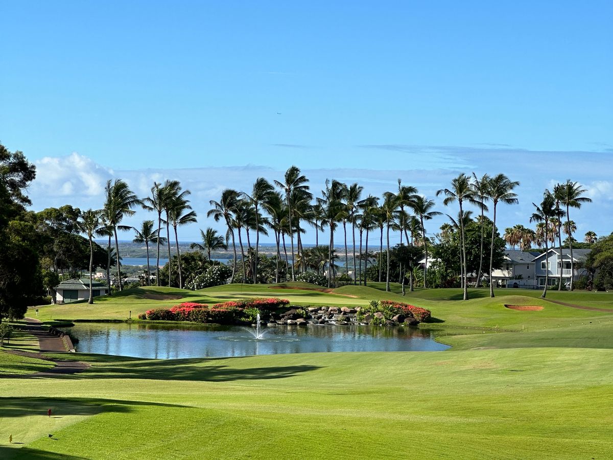 前々日からオアフ島では珍しい長雨の中、当日も天気が危ぶまれましたが、奇跡的に雨は降らず楽しいラウンドができました。パール湾に加え遠目にはダイヤモンドヘッド、ワイキキのビル群が見え快晴なら素晴らしい景色だったと思います。ローカル色の濃い素朴な施設ながら、コースレイアウトは単調ではなく、再訪必須のゴルフ場となりました。