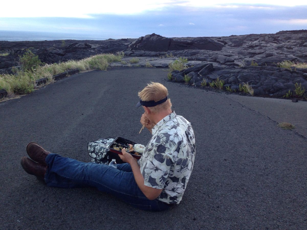 すてきな写真も送って頂き、ありがとうございます。なんだかマイク、絵になっていますね(笑)。ここは、チェーンオブザクレーターズロードの途中、溶岩の流れで道路がつぶされてしまった場所ですね。こんな場所に座ってのお夕食は、なかなか体験できません!大自然を肌で感じられたこの1日を、覚えていらしてくださいね。この日は風が強かったのでしょうか?マイクはアウトドアが大好きなので、雨さえ降っていなければ、強風はなんのその・・・かもしれません(笑)。