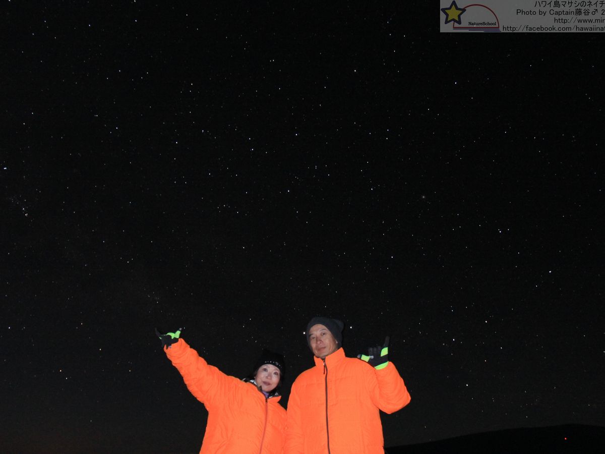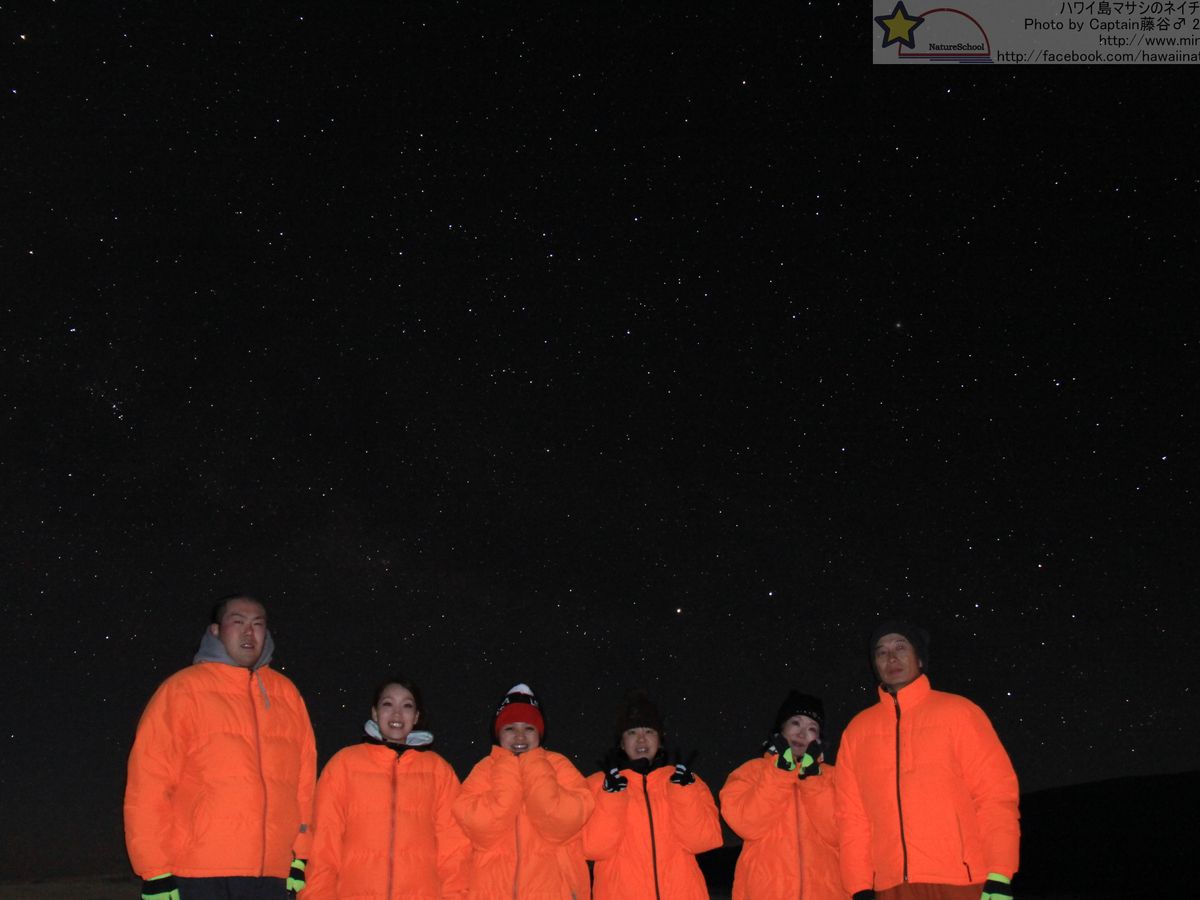 そして、最後はマウナケア山のふもとで、星空観察。澄んだ寒い空に満点の星が輝いていました。ウインドブレーカーを貸してもらえますが、セーター、マフラー、靴下は必須。貸してもらった双眼鏡で見た「かに座」の宝石箱のような輝きが忘れられません。