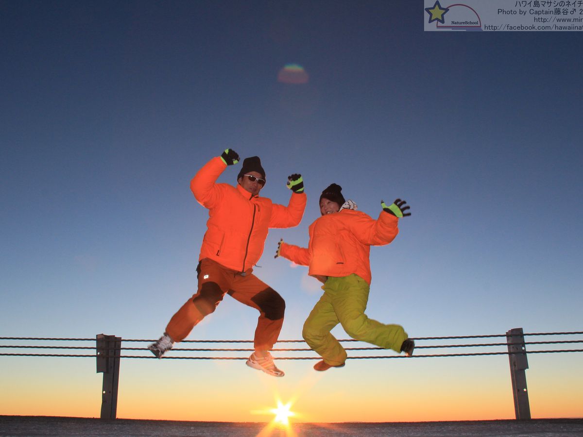 サンセットは参加のしやすさで催行会社も多いので山頂は込み合うのだそうです。サンライズは3社しかないそうでその中でも、マサシネイチャースクールはサンライズを始めた最初の会社とのことです。他社よりも防寒着も一番きちんとしたものでした。とはいえ、私たちはダウンもヒートテックX2、薄手のセーター、登山用冬ズボンにアンダー、カイロと万全でしたので全く寒くありませんでしたが、同行の女性たちは、軽装でしたので随分寒がっていて気の毒でした。私たちの行った日は暖かい方のようでしたが、この1週間前ほどは凍結で上がれなかったくらいですので、防寒はしっかりした方が体力温存のためにも良いと思います。