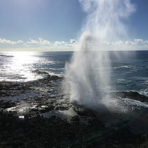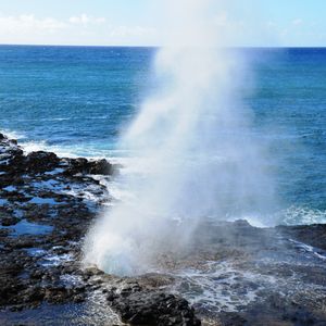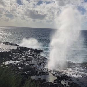 はじめに向かったのは、ポイプ潮吹き岩。オアフ島東海岸のハロナ潮吹き岩よりも間隔が短く、吹き上がる高さもあるのでこちらの方が断然迫力がありました。ガイドさんはこちらから頼まなくても、私たち夫婦などそれぞれのグループごとに写真を撮ってくれるので、まさにかゆい所に手が届く感じでした。