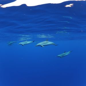 始終盛り上げてくださったこともあり、いるか探しの長い船旅も楽しめました!私がシュノーケリングを体験させていただいた日は、いるかを見るために3回、ウミガメをみるために1回船から海の中に飛び込み、シュノーケリングに挑戦しました。いるかを探しながらゆっくりと船で進み、いるかが怖がらないよう程よい位置で船がとまり、海に飛び込むのですが、1回目は飛び込んだときの音などでいるかが警戒してしまったようで集まって泳いでいたいるかがあちこちに移動してしまい、海の中のいるかをみれたのは数人程度でした。私も1回目では、見れませんでした。ですが、なんとしてでもいるかに会おうと次もチャンスあるから!私についてきて!と励ましてくださりました。そして2回目!いるかが集まっている場所があったので飛び込みましたが、結局会えず、、、。でもなかなか会えないと言われていたまひまひ(シイラ)の群れに遭遇し、泳いでいる姿を見ることができました!スタッフの方もみんな大興奮でテンションが上がりました。ついに3回目!ようやく待ちに待ったいるかを見ることができました。群れでたくさん泳いでいるところをみることができ、いるかから近づいてきてくれてすぐ横にいるかが泳いでいて一緒に泳いでいるようでした!!船で浅瀬まで移動すると、今度はウミガメに会うことができました。とても近い距離で海から顔を出すウミガメをみたり海の中を泳ぐウミガメをみたりすることができました。