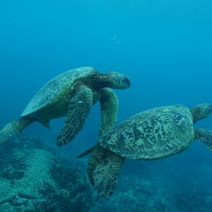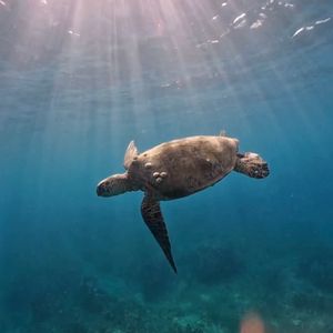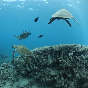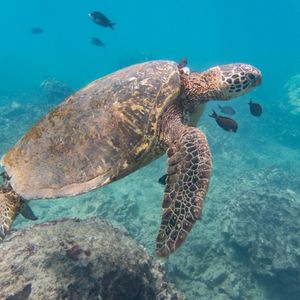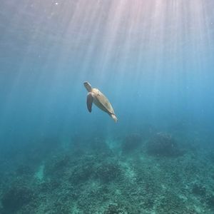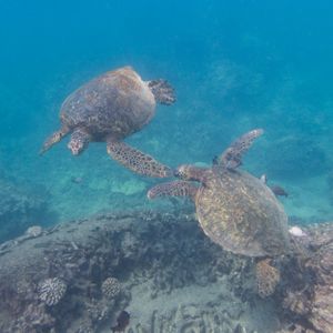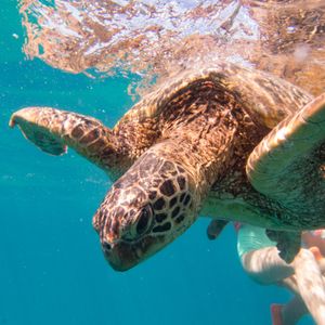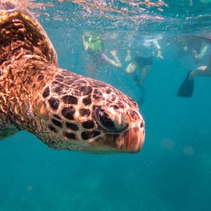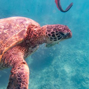 ウミガメシュノーケリングでは、船がウミガメの生息地に到着すると、参加者はシュノーケリング用の装備を着用し、ガイドの指示に従って海に入ります。ウミガメは海中でゆったりと泳ぎ回っており、シュノーケリングをしながらウミガメを間近で見て楽しむことができます。