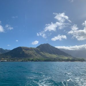 事前に行のバスの中でイルカの知識も教えってくださったり、ご担当頂いた方が凄く和やかに楽しませてくださったので移動は少しありましたが、あっという間に目的地に着きました!ザ・ハワイ!の自然に囲まれて、いざ船に乗り込みイルカが見れるポイントまで移動中(この間、船酔いの方が多かったので事前に酔い止めを飲んでおくことをお勧めします…!)、嬉しいことにカジキが見れたので大興奮しました!
