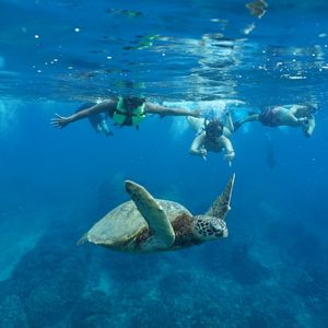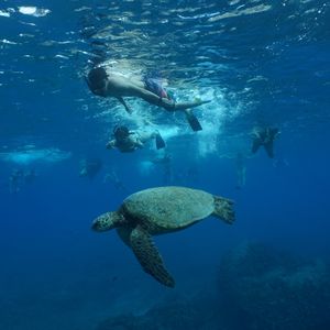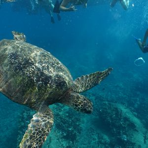 最初ハーバーから少し離れた所まで行き、船上からたくさんのイルカが泳いでいる姿を見ました。それから更に岸から離れた所に行くと思いきや、砂浜近くの岩場まで戻りシュノーケリング。海亀は目の前で何度も見られましたが、海の透明度は低くカラフルな熱帯魚は数匹レベル、太陽の光りが差し込むブルーな海で、熱帯魚に取り囲まれることを期待していたので残念でした。イルカと海亀を見たい人は十分楽しめると思います。シュノーケリングを満喫したい人は違うツアーにした方が良いと思います。