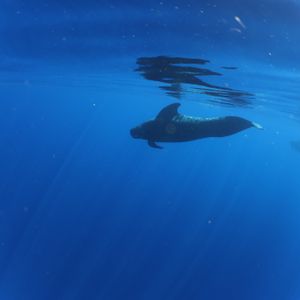 出航して45分くらいでイルカが見えるポイントに着くという話を聞きましたが、1時間半から2時間くらいはイルカの姿が見えず、ずっと船が動いている状態でした。野生の動物なので、出会えないこともあると注意書きにもあったので、もしかしたらイルカに会えないのではないかと心配になりました。しかし、遠くで水しぶきを見たとのカメラマンさんの言葉をきっかけに、そこに近づくとイルカの背びれが見えました。だんだんと近くなり、船と一緒に泳いだりジャンプしたりするイルカを見ることができたので、感動しました。とてもかわいかったです。シュノーケルを装着し、海に入ると、真っ青な海にイルカの姿が見えました。自分の足元の何メートルか先にイルカの群れが泳いでいくのも見ることができました。