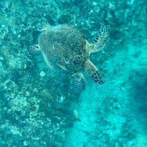 その後、ウミガメのいるポイントへ移動しました。ダイブする前に船上からウミガメを近くで見ることができました。また、ダイブしてからもウミガメを見つけることができ、ゆったりと泳ぐかわいい姿を眺めることができました。20分から25分シュノーケリングをできるとのことで、イルカのときよりもゆったり見ることができました。それでも、楽しくてあっという間に時間が過ぎました。