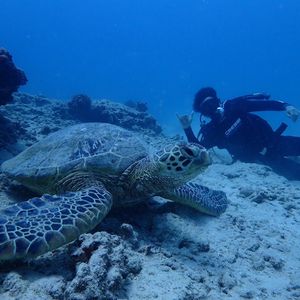 完全な初心者でも、インストラクターの丁寧なサポートで安心して楽しめました。目的の海亀とは1ダイブで3匹ほど遭遇、運が良ければもっと会えるとのことでしたが、それでも至近距離でばっちり記念写真も取れました。