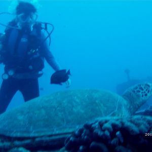 ハワイでは初めて潜りました!ウミガメもたくさん見れ、潜降していきながら見えてくる沈船に、ワクワクが止まらなかったです(^^) 水温24度で寒かったですが、とてもいい経験になりました♡看板犬のスシちゃんも可愛かったです♡