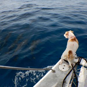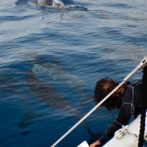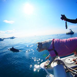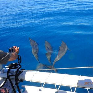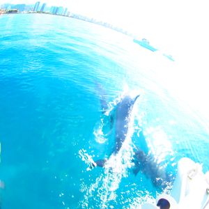 ダイビングから港まで帰る途中に、船の近くにイルカの群れが寄ってきて見ることができ、ラッキーでした。