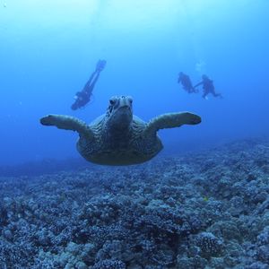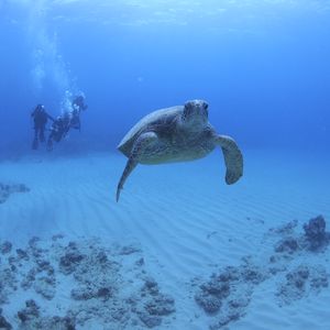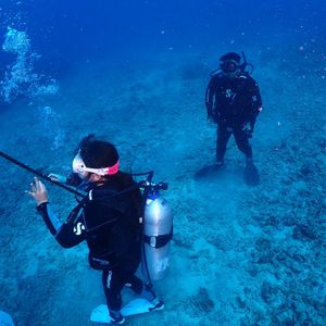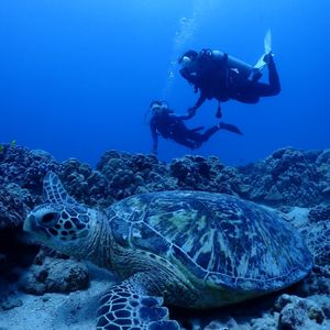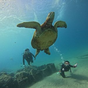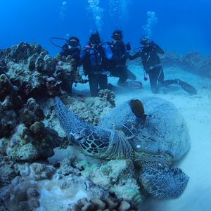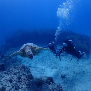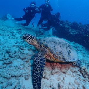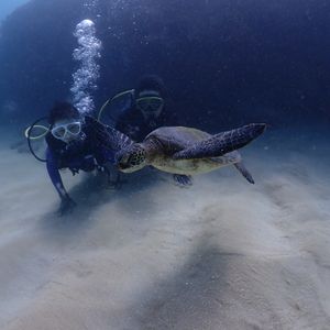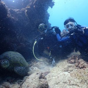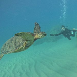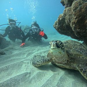 今回の体験では二人で参加させていただきました!私は、ダイビングが初めての体験でしたが、インストラクターさんと僕たちだけだったので最初から最後までとても楽しく過ごすことができました!送迎の車の中でも色々な話をし、ダイビングで遭遇する魚の紹介もありましま。ダイビングをするときに装備の説明から使い方、浅瀬で練習などをしてくれたのて、インストラクターさんが付きっきりなのでわからないことがあればすぐにで聞くとかもできたので安心して潜ることができました!海の中を進むと色々な種類の魚が沢山泳いでおり、車の中で紹介してもらった魚もいたので探索のような気分で楽しむことができました!少し潜った場所に行くとなんとウミガメに遭遇することができました!!そして、ウミガメの横を一緒に泳ぐこともでき、インストラクターさんが泳いでいる写真や動画も撮ってくださりとてもいい思い出になりました!帰りにはハワイのおすすめの店を教えてもらえたり、海の中で撮った写真や動画を見せてもらいました!とても話しやすいインストラクターさんだったので最初から最後まで最高の体験ができとてもおすすめです!!!