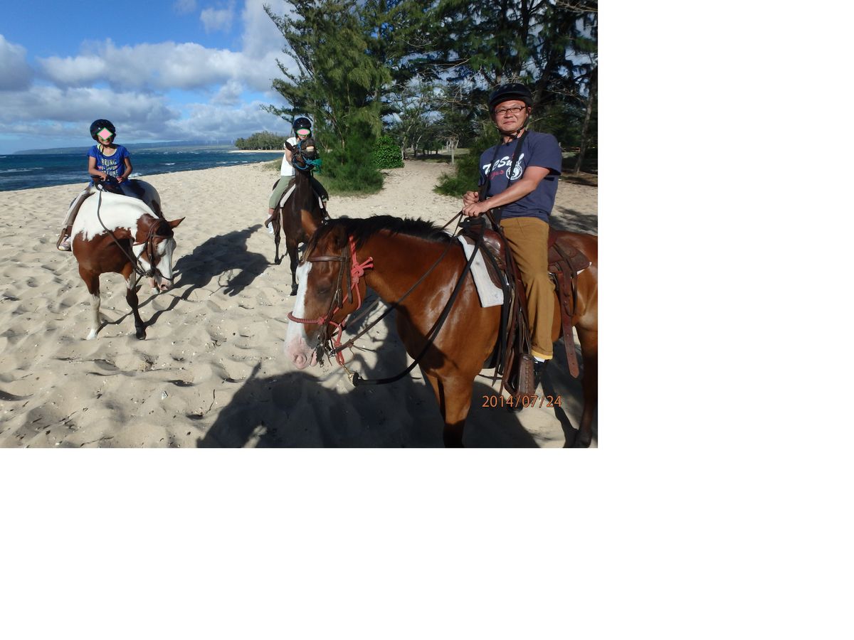 乗馬体験は、日本でできるような係の人が常に隣にぴったり付いてるような乗馬と違い、馬に載せてもらった後は、1人で歩かせてくれます。私の馬(ニオイ)はとてもお利口で、前の馬が止まると草を食べたりしていましたが、前が進むとしっかり付いて歩いてくれたので、全く操縦をすることがなかったです。主人の馬(リオ)は草を食べに寄り道して、大変そうでした。担当する馬によって全然違うみたいでした。乗馬での海辺散歩は気持ちよくてとても楽しかったです。
