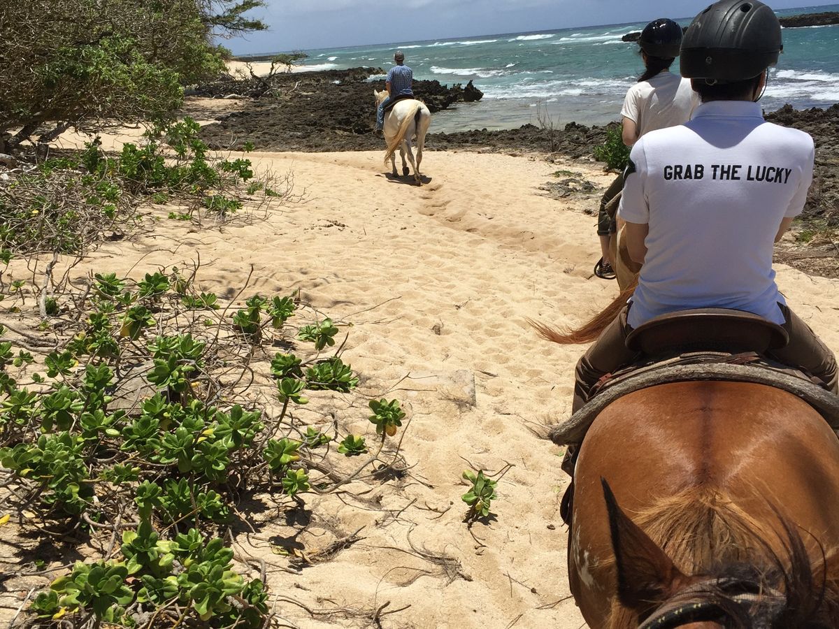 ノースショアの町では観光というほど時間はありませんでしたが、ガイドさんおすすめの美味しいガーリックシュリンプとマツモトシェイブアイスを食べることが出来ました。乗馬は初心者なので、不安はありましたが、海辺のきれいな景色をお馬さんの背中という普段とは違った視点から堪能できて楽しかったです。馬がおなかを空かせていたようで、言うことをなかなか聞いてくれずに苦戦しましたが、草をつまみ食いしているとき以外は、手綱を切らずともコースを外れずに歩いてくれて、意外と簡単に乗馬が出来ました。ビーチからウミガメが見れなかったのが残念でしたが、時間に余裕があったため、ガイドさんが人気のコーヒーの直売所に連れて行って下さり、試飲を楽しめたため、少し得をした気分になれました。
