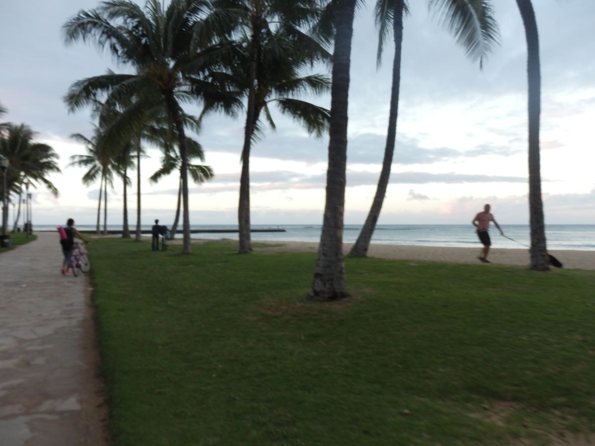 母と娘で早朝ヨガに参加しました。トロリーが走る前にホノルルズー入口集合でしたので、宿泊先のヒルトンハワイアンビレッジから浜辺沿いに歩いていきました。風は強かったのですが、良い天気でしたので、早くもわくわくしていました。