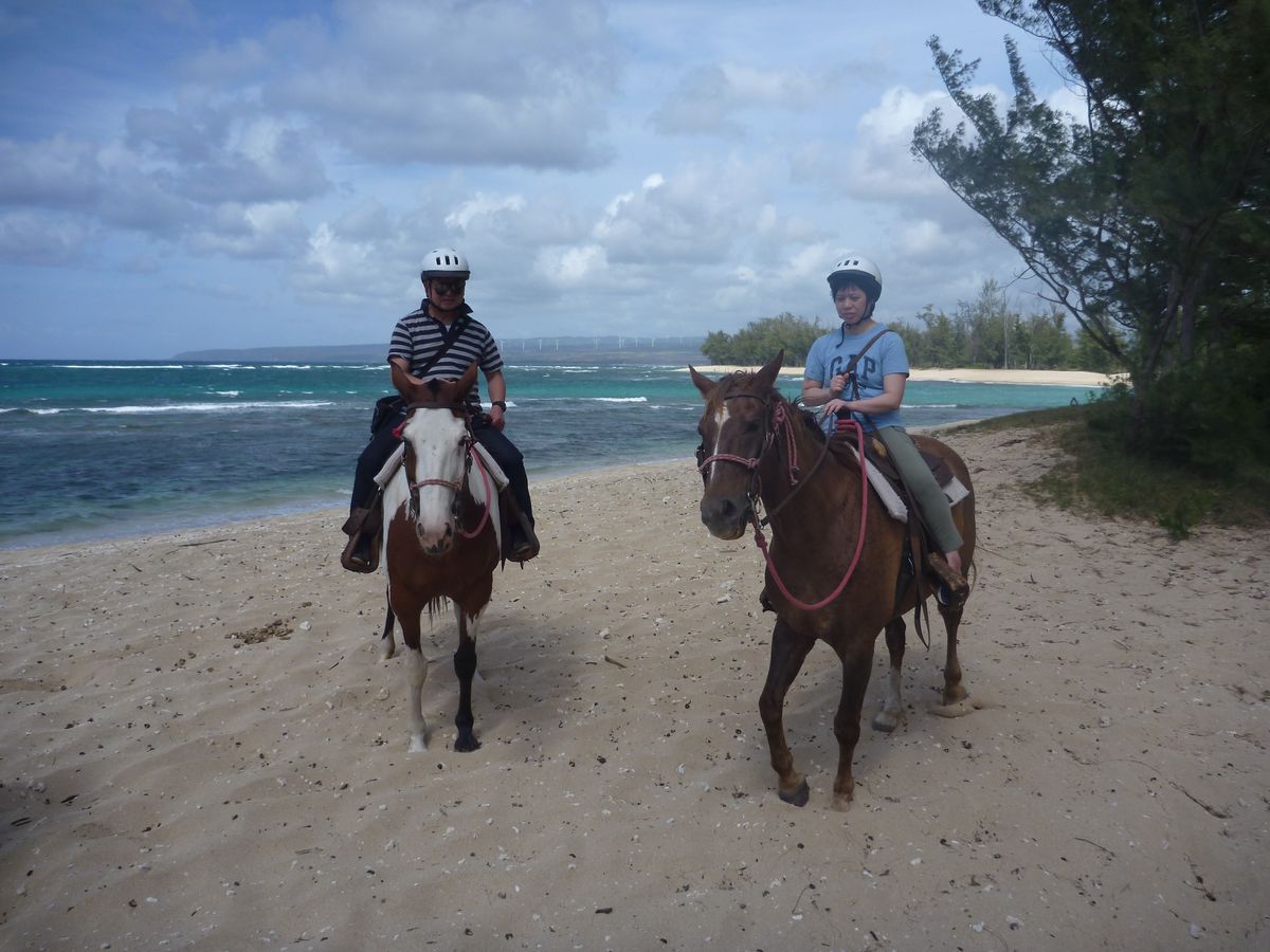 ノースショアの海辺で乗馬ができる、波打ち際で馬を走らせる事ができるとの勝手な思い込みで申し込みをしましたが甘い考えでした。海岸の側は通りますが海には行きません。コースに背の高い草が茂っており、眺めも余り良くないです。馬は良く人に慣れており、途中大きな音(拳銃の発射音?)がしても暴れることも無かったです。初心者向きの乗馬かなと思います。
