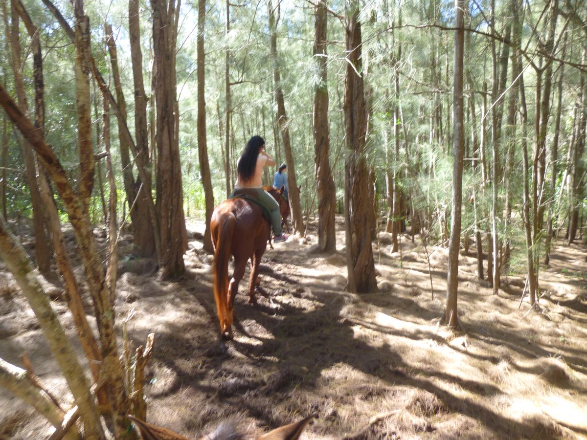当日はとても良い天気で渓谷ツアーを選んで良かったと思いました。12月でハワイとしてはそれ程暑くない季節のようですが、炎天下にいるとかなり暑いです。このツアーは渓谷乗馬というよりは林間ツアーと呼んだ方が合っている感じはしますが、木々の木漏れ日の中のアップダウンの続く山道を馬に乗っていくのはとても気持ちが良いものです。また、丘の上の草原を横切る時には野生の猪を見ることもできました。