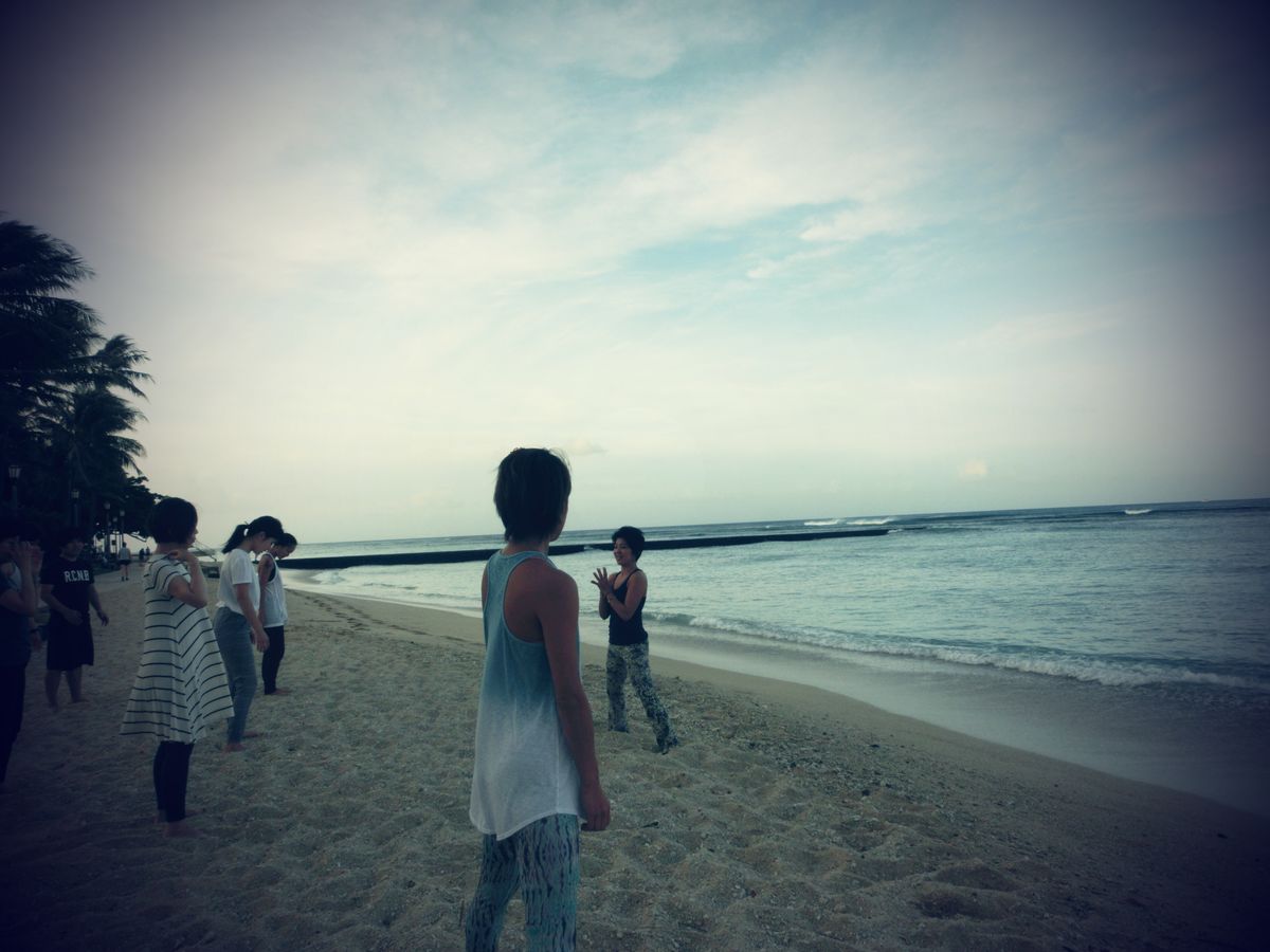 波の音が結構大きかったので、先生の声が聞こえないときがありました。見よう見まねで何とかついていきました。砂浜に足を取られるからか、室内よりもキツかったです。