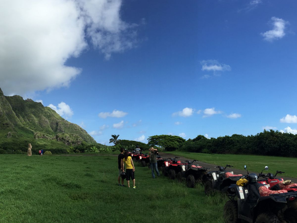 今回は1時間の乗馬(送迎なし)でしたが、現地まではホノルル市内のホテルからレンタカーで移動し、受付開始の30分くらい前に到着。当日は日本人を含め、たくさんの参加者がいました。天気はまずまずでした。