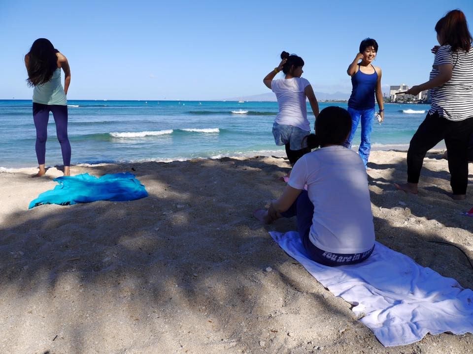 場所は、カピオラニ公園のホノルル動物園の前の集合だったので、近くのコンドミに泊まっていた我々にとっては、非常に近かった。インストラクターと一緒に、近くのビーチまで歩いていくと、真っ青な空とワイキキと海が我々を迎えてくれた。波の音と風を感じての初めてにしては贅沢なヨガレッスン。だが、すぐに自分の体がこんなにも硬くコチコチになっていることにあらためて、気づかされる。普通のドッグスタイルでさえ、何もしないのに辛い。汗がじわじわと湧いてきた。背骨のわきの筋肉、肩甲骨まわりの筋肉、太もも裏の筋肉がすべて硬い。レッスンが進むにつれ、だんだんとインストラクターの指示についていけない。まわりの生徒さんも辛そう。大粒の汗が吹き出る。「無理しないで休んでいいですよ〜」というインストラクターの一言に救われる。さらに難易度の高いポーズとなるが、結局全くついていけずにできなかった感じで終了。ただ終わったあとは、いつもバリバリに凝っていた首から肩の奥のコリが不思議と緩んでいることに気がつき、驚いた。上半身からは玉粒の汗。そして、どんなポーズでもインストラクターの背中がきれいに伸びている姿勢を見て、いつもPCに向かってついつい猫背になっている自分との違いをまざまざと感じた。はじめてのヨガレッスンで、点数をつけると10〜20点くらいだろうが、気分は100点に近い。それは、自分なりのペースでも、終わったあとの爽快感が単なるストレッチとは違って、体の奥のコリまで届くようなほぐしとでも言えようか、かなり軽くなりました。ぜひ、初心者のみなさんも体験してみてください!!!