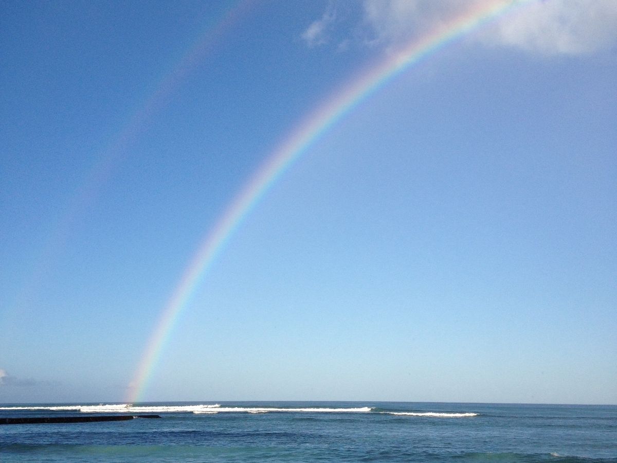 念願のビーチヨガ体験。レッスン前、大きなダブルレイボーが海にかかり、最高の一日のスタート。