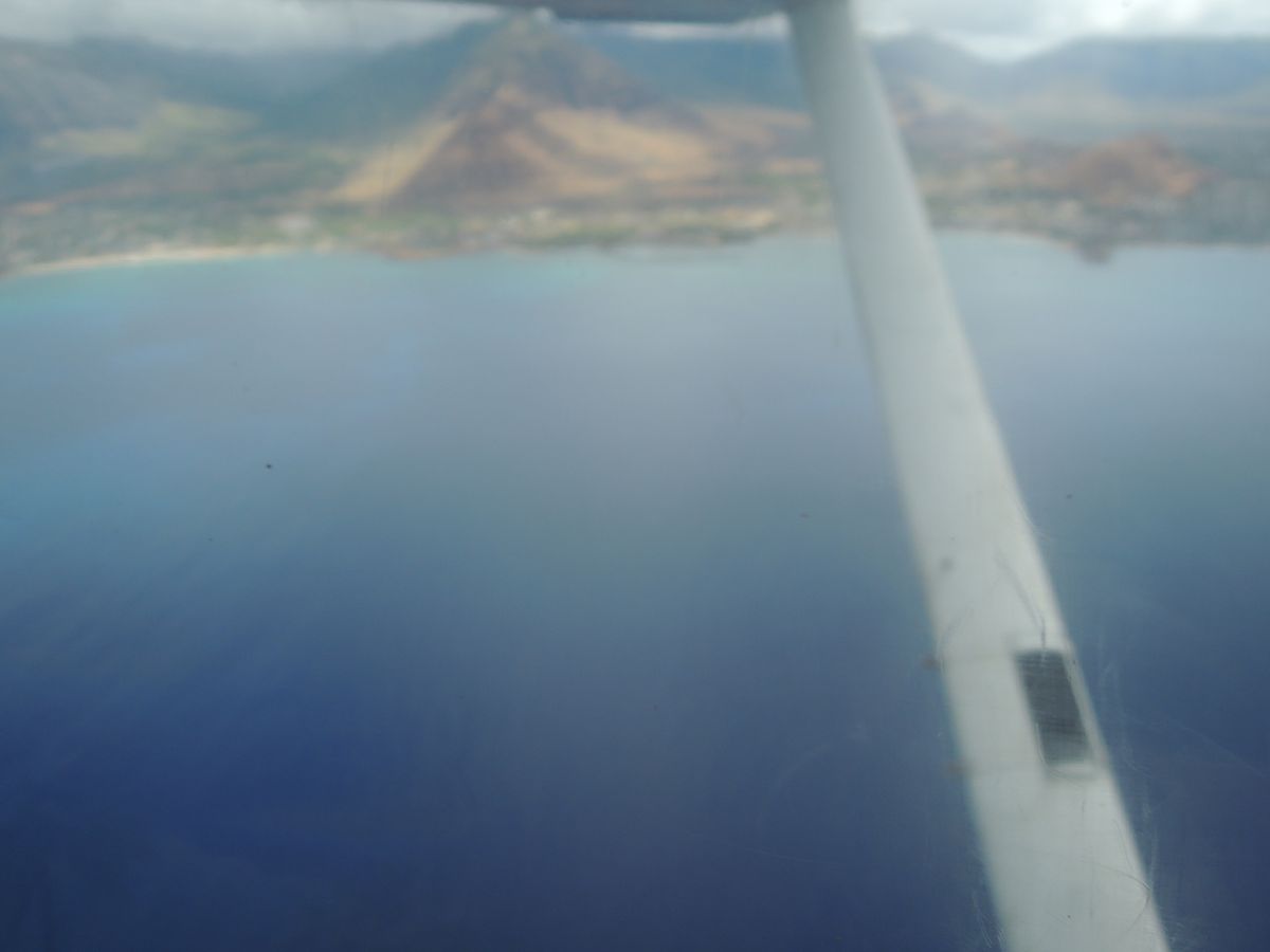 この日の航路は、離陸後オアフ島の海岸線を西回りに島の北西部まで飛んで、ハレイワの街から南下して島を縦断し、真珠湾上空を通過して空港へ戻るルートを飛びました。