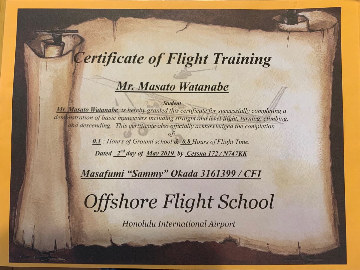 優しい素敵なインストラクターの説明を聞きながら、スロットルを全開にしてスピードメーターの針を確認しながらの離陸、操縦桿をゆっくり引き、全く自然にゆっくり上昇して行く様は感動そのものです。機上ではエンジンの微動と気流を感じながら、岡田教官のお陰で終始リラックスして写真も撮りながらの飛行でした。特に真珠湾上空からの景色は、80年近く前の日本の若者が見たであろう情景であり、感慨もひとしおでした。行き帰り共に真珠湾上空をコースにして頂き感謝しています。当セスナ体験操縦、体感してみてください。100%オススメです。岡田さんお世話になりました。時間が許せばお話をもっと聞きたかったですよ。今後のご活躍お祈りしています。社長様、一人の為にホテルまでお送り下さり、ありがとうございました。