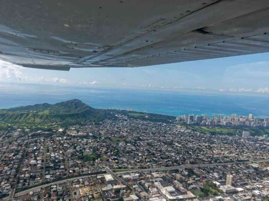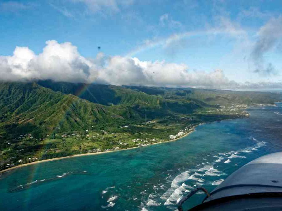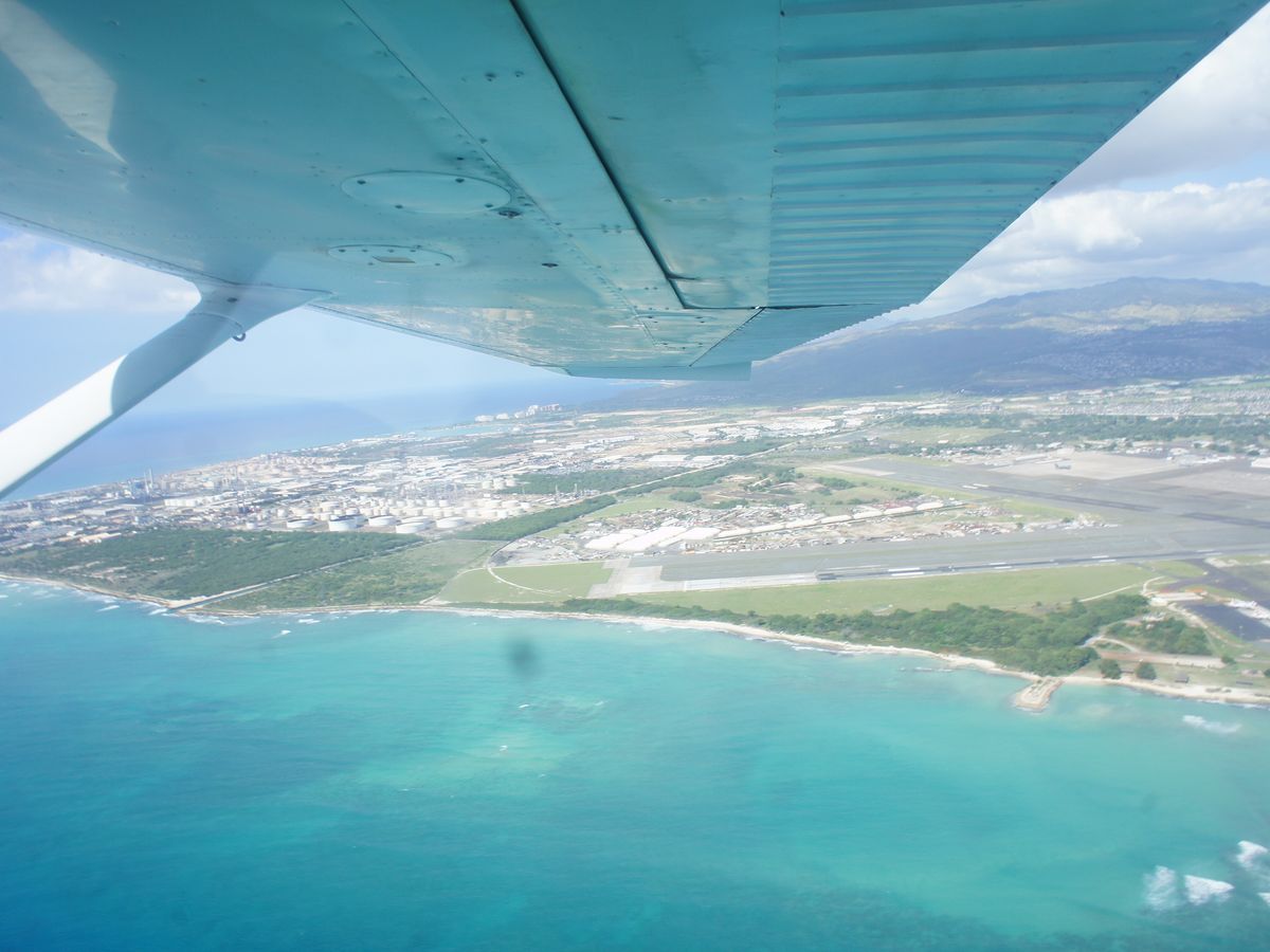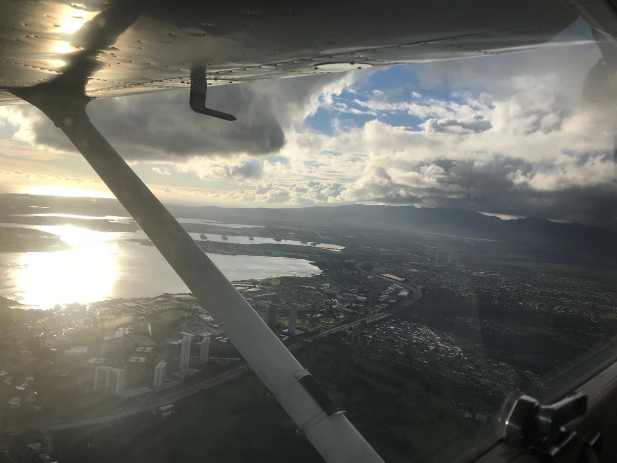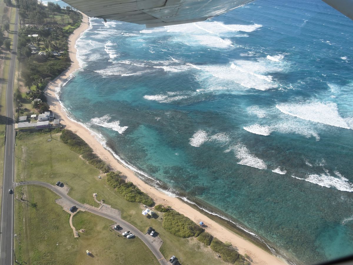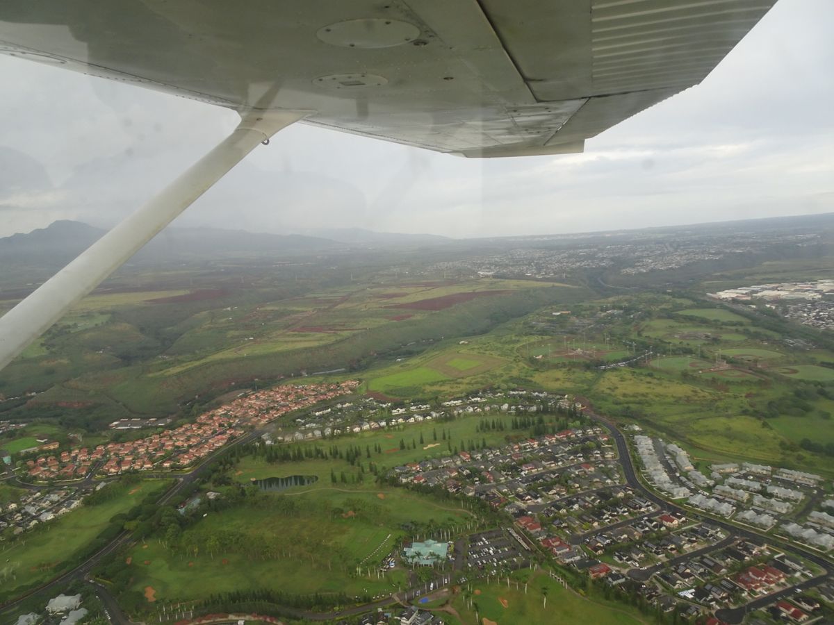 操縦は初めてでしたが簡単な説明のあとすぐにフライト、指示は全て英語なので簡単な英語と操縦方法は理解できる必要がある。離着陸と足のラダー・スロットル操作は教官がやってくれるのでハンドル操作に集中できます。一人だと周りを撮影する余裕がないので2~3人で予約し交代で操縦すると良いでしょう。今回はオアフ島を左周りに1周、私がイノウエ空港からディリンガム飛行場、息子がディリンガム飛行場からイノウエ空港まで操縦。低高度を飛ぶのでオアフ島の有名ポイントがすべて見られます。