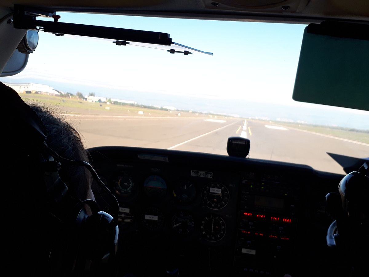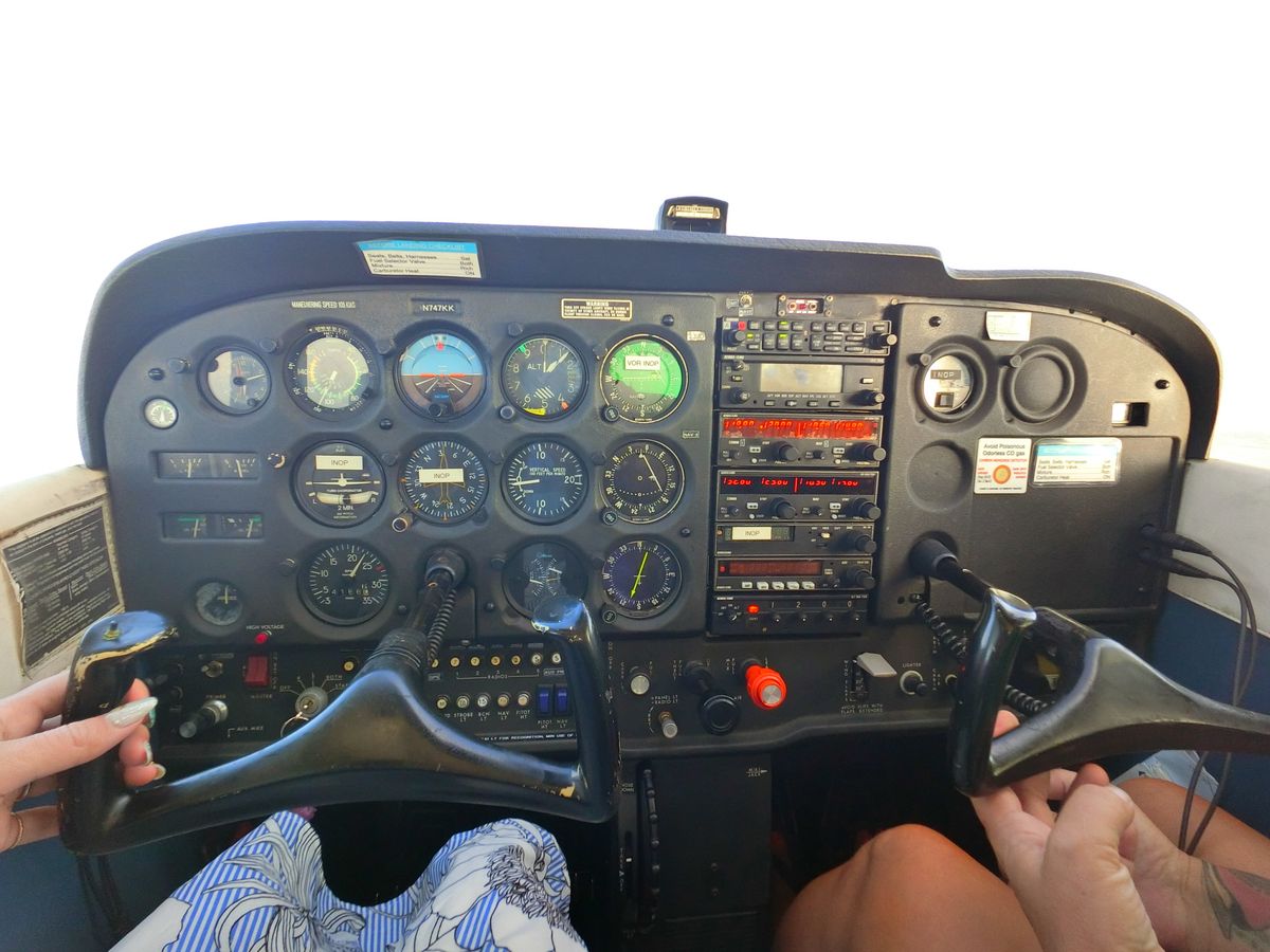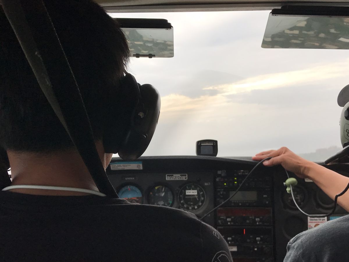 セスナ操縦体験とあったので「体験」かと思いきや、なんと自分で操縦桿を引いて離陸!アメリカ人のインストラクターは横に乗ってニコニコしながらアップダウンと右左の指示を出すだけ。ちなみにインストラクターさん操縦桿には片手で触れてるだけです。