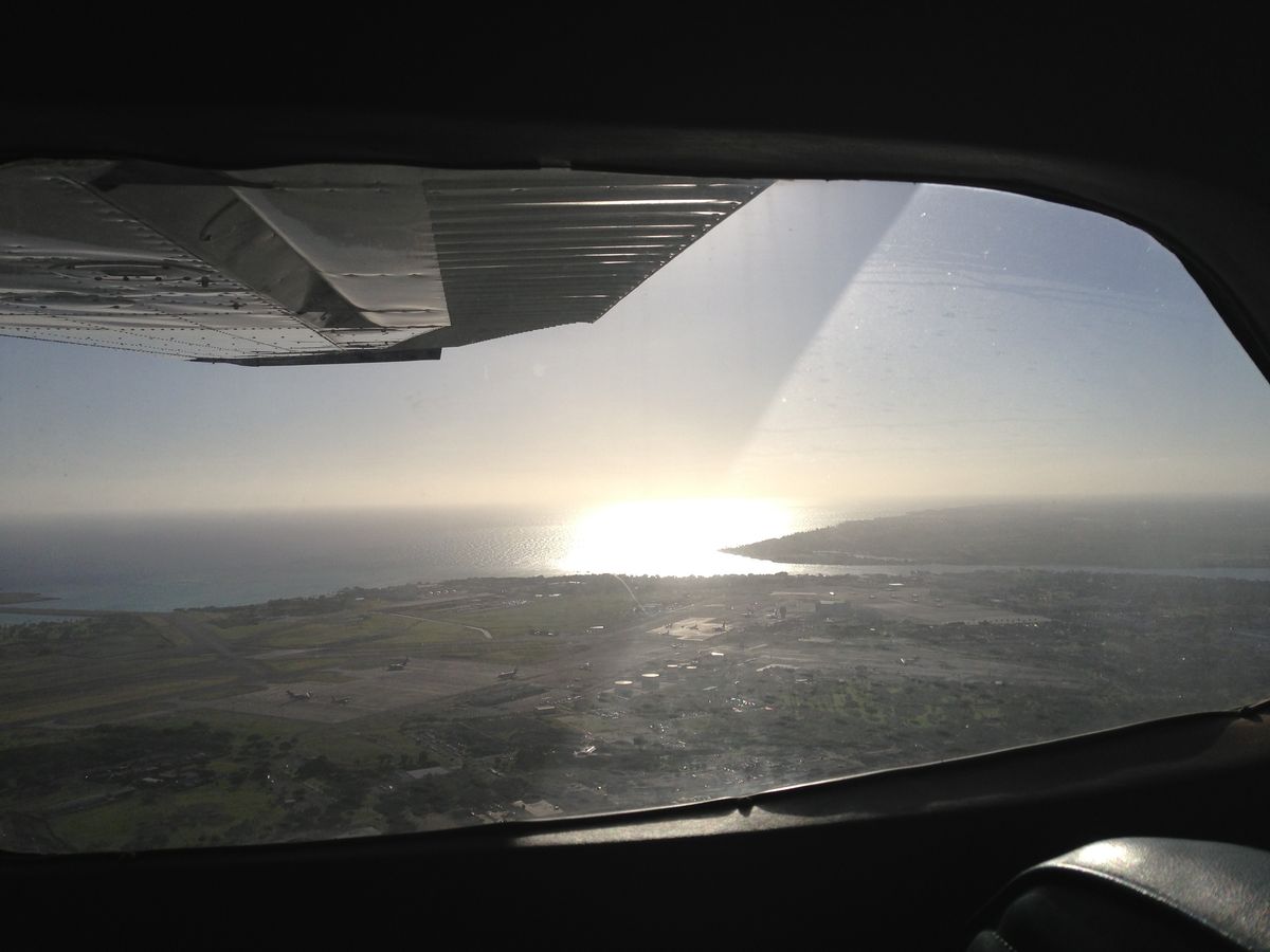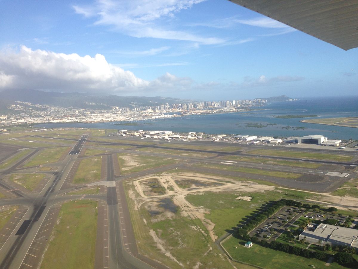 事前にフライトシュミレーションで練習。地上の指導もそこそこに、離陸。上昇、下降、旋回とスムーズに。パール・ハーバーの眺めは最高でした。