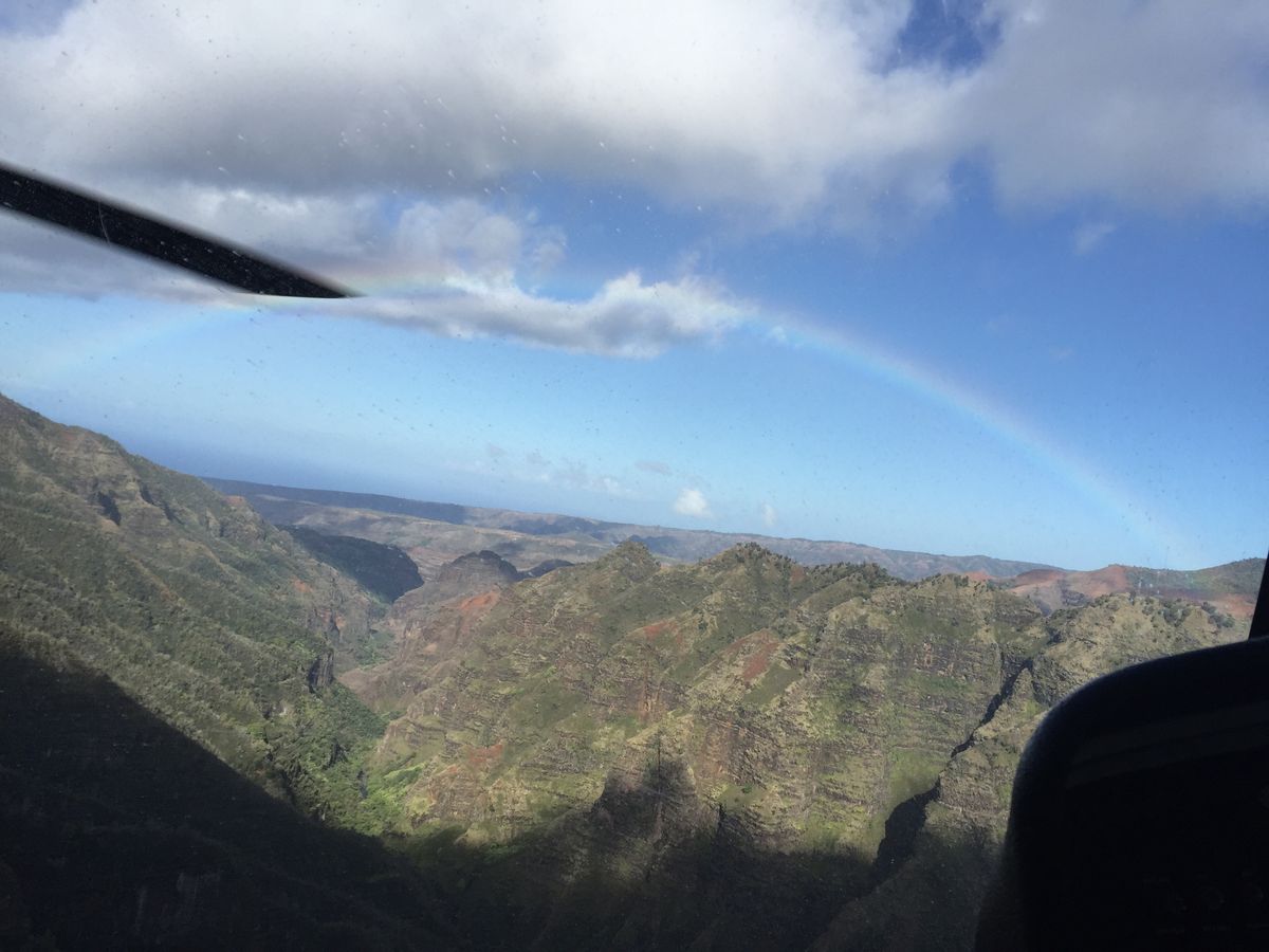 今回は滞在日数が3日間という短い時間しかありませんでしたので、とにかく限られた時間内でカウアイ島のすべてを楽しもうと思い、初日にまずこのヘリコプターツアーを申し込みました。ツアー会社の方も皆さん陽気でしたが、パイロットのグレッグさんも非常に良い方で、出発前の記念撮影もバッチリOK。ファーストクラスと呼ばれるヘリの前列シートに乗りましたが、ちょっとお高い料金の分はありました。あの険しい山を上がり切った先には深い峡谷、前列シートでは味わえないスリル満点。でも決して恐怖心は出なかったのが不思議です。アッという間の1時間のフライトでしたが、カウアイの島を全景を楽しむことができ、大満足でした。次回はもっと長い時間飛んでみたいと思います。