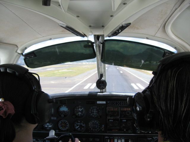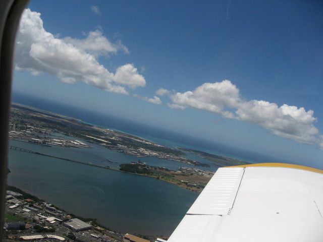 オフィスで今回操縦体験するセスナ機の操縦方法の解説ビデオを見た後に、実際に飛行機に乗り込みます。大型旅客機が離発着する中をホノルル国際空港から離陸、ノースショアの飛行場に着陸したところで操縦を交代します。(今回は2人で参加したため、往路と復路で半分ずつ操縦を体験しました。)交代後、すぐに離陸し、往路と同じルートを引き返します。そしてパールハーバー上空を通過し、ホノルル国際空港に着陸です。2人で参加すると操縦も体験でき、また後部座席から写真を撮ることもできるためお得です。