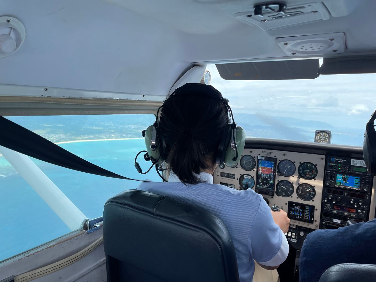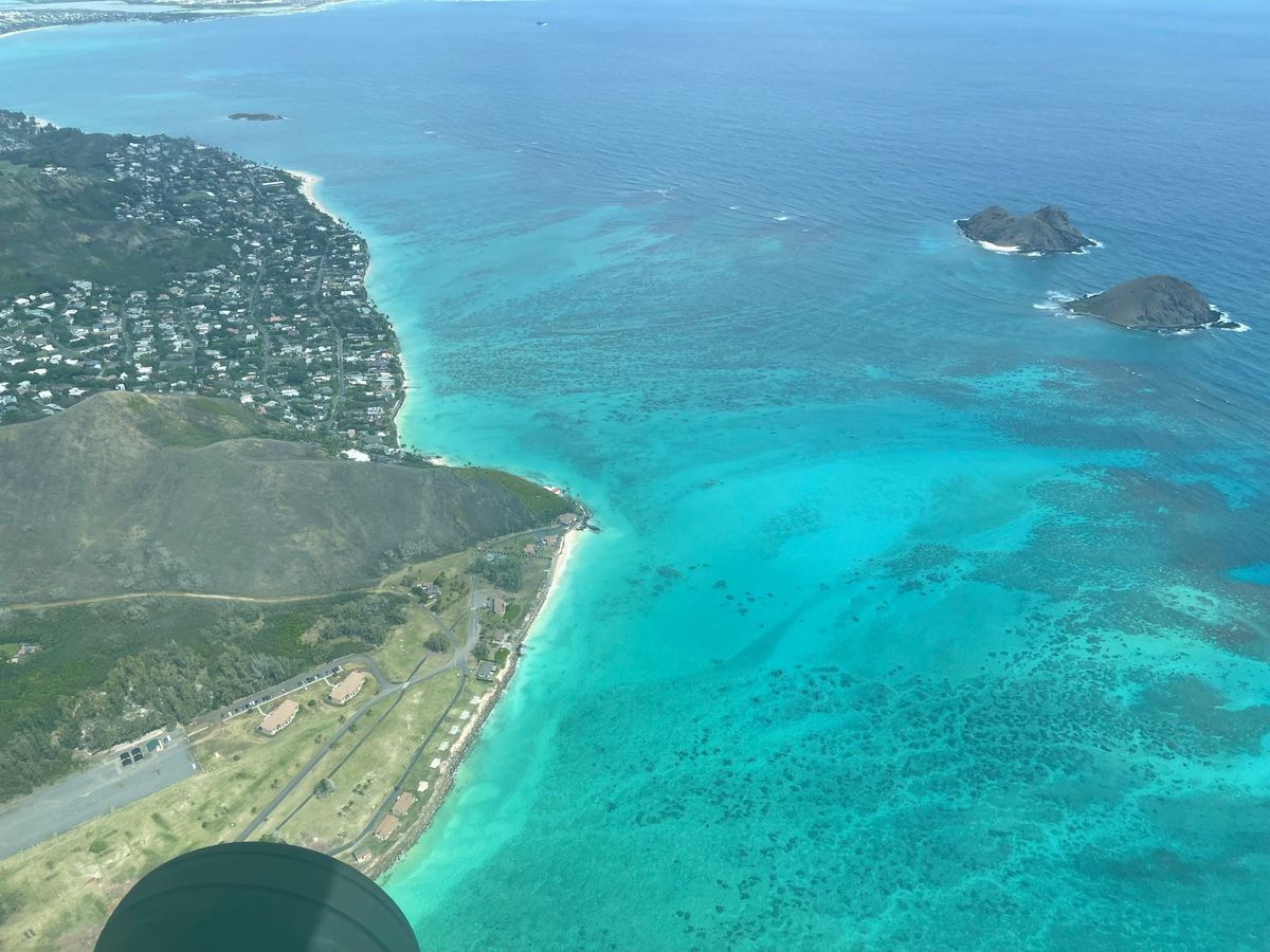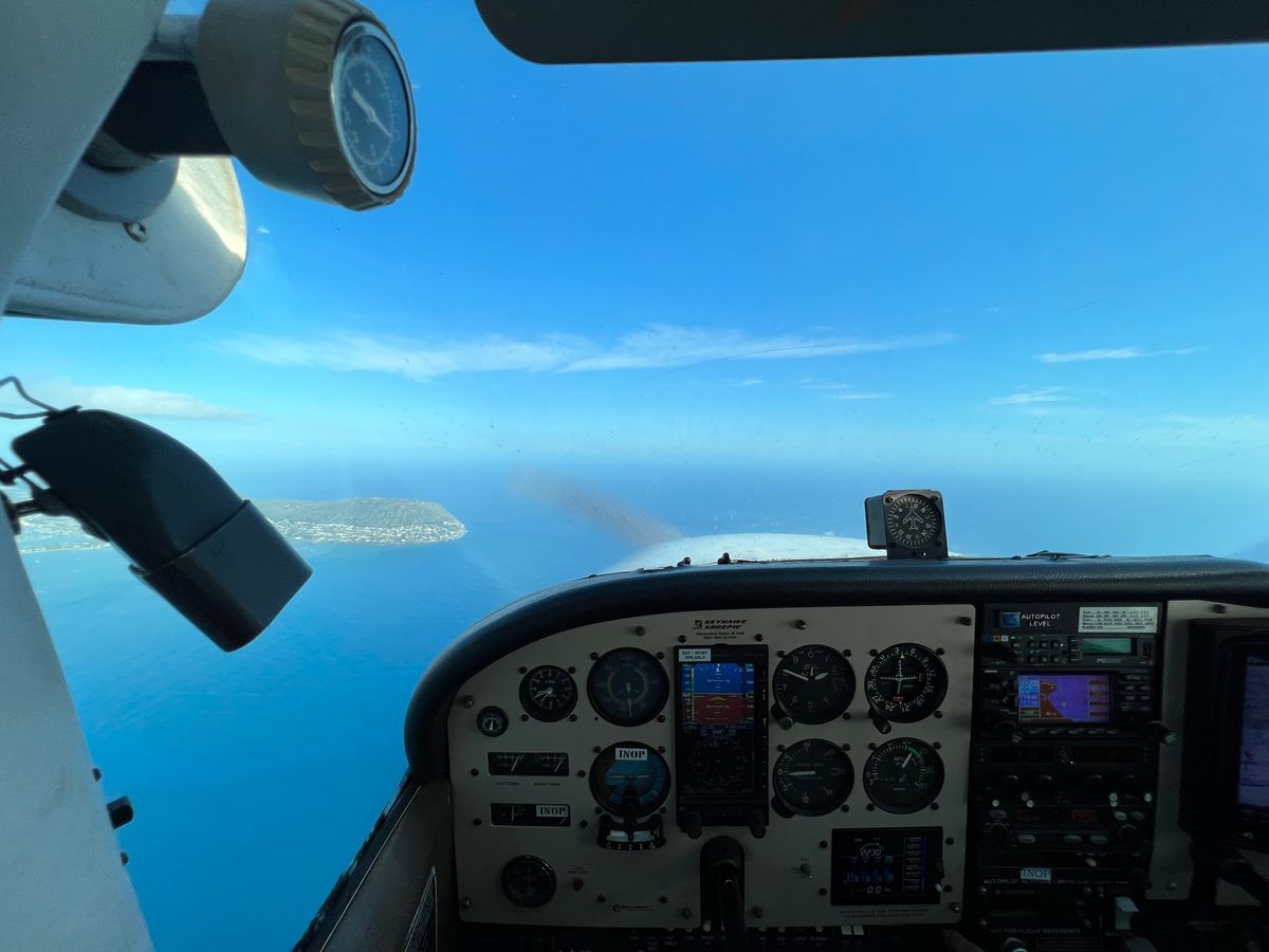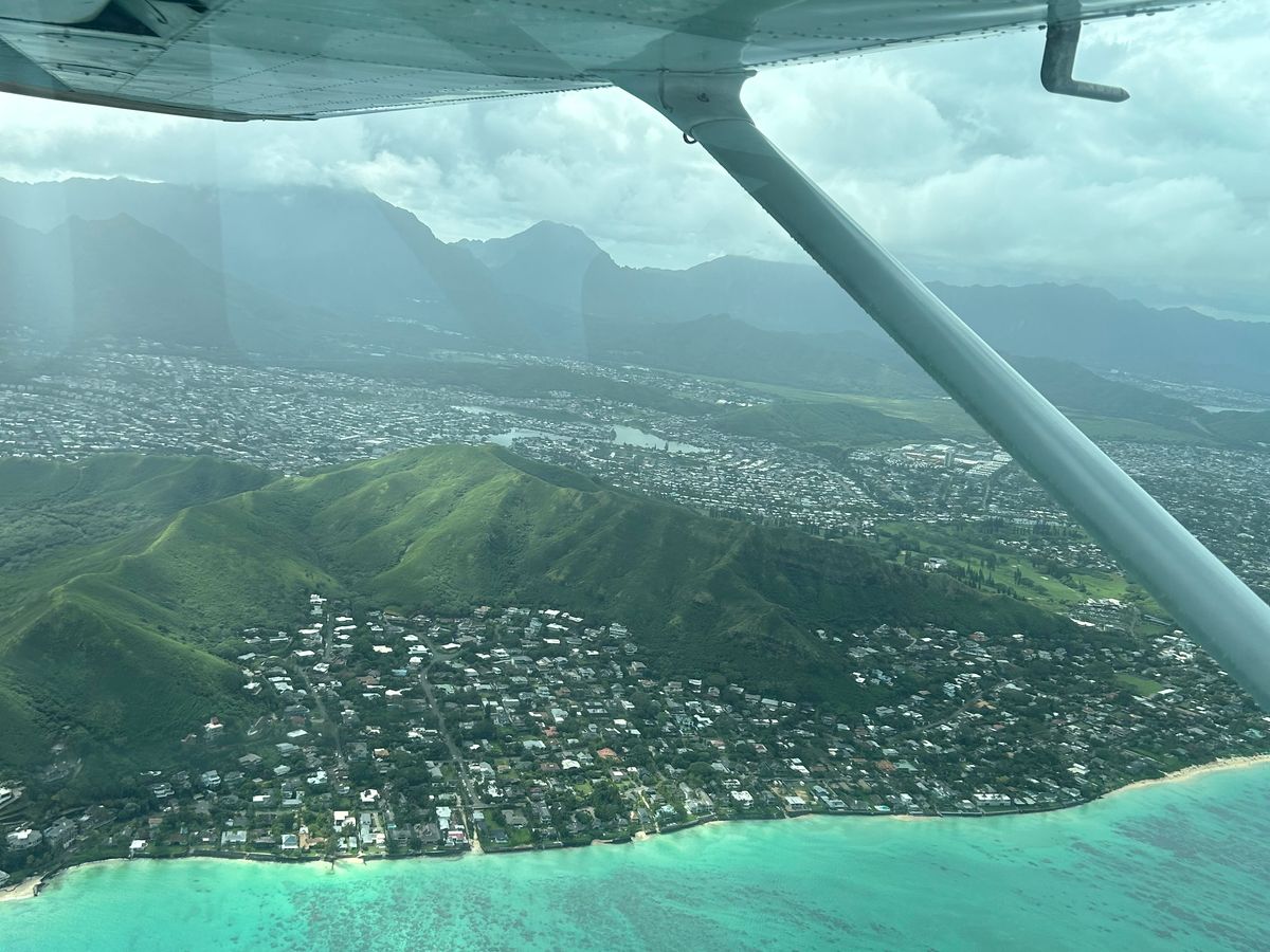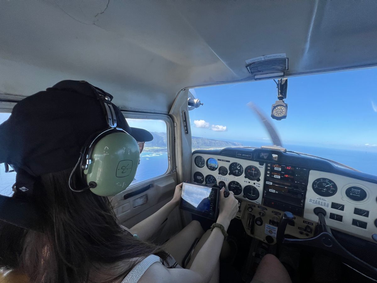 空の上での同乗者間のコミュニュケーションは、ヘッドフォンとマイクで行います。パイロットと管制塔とのやりとりも、ヘッドフォンで聞くことができて刺激的です!安定した空域に入ったら操縦桿を握って実際に操縦させてもらい、海上では左右への旋回も体験させてもらいました️また、今回はふたりでオアフ島を一周するプランに申し込んだのですが、席替えをするために、途中でカラエロア空港というローカルな空港に降り立てたのも他ではできない経験だなと感じました(行き帰りはホノルル空港)