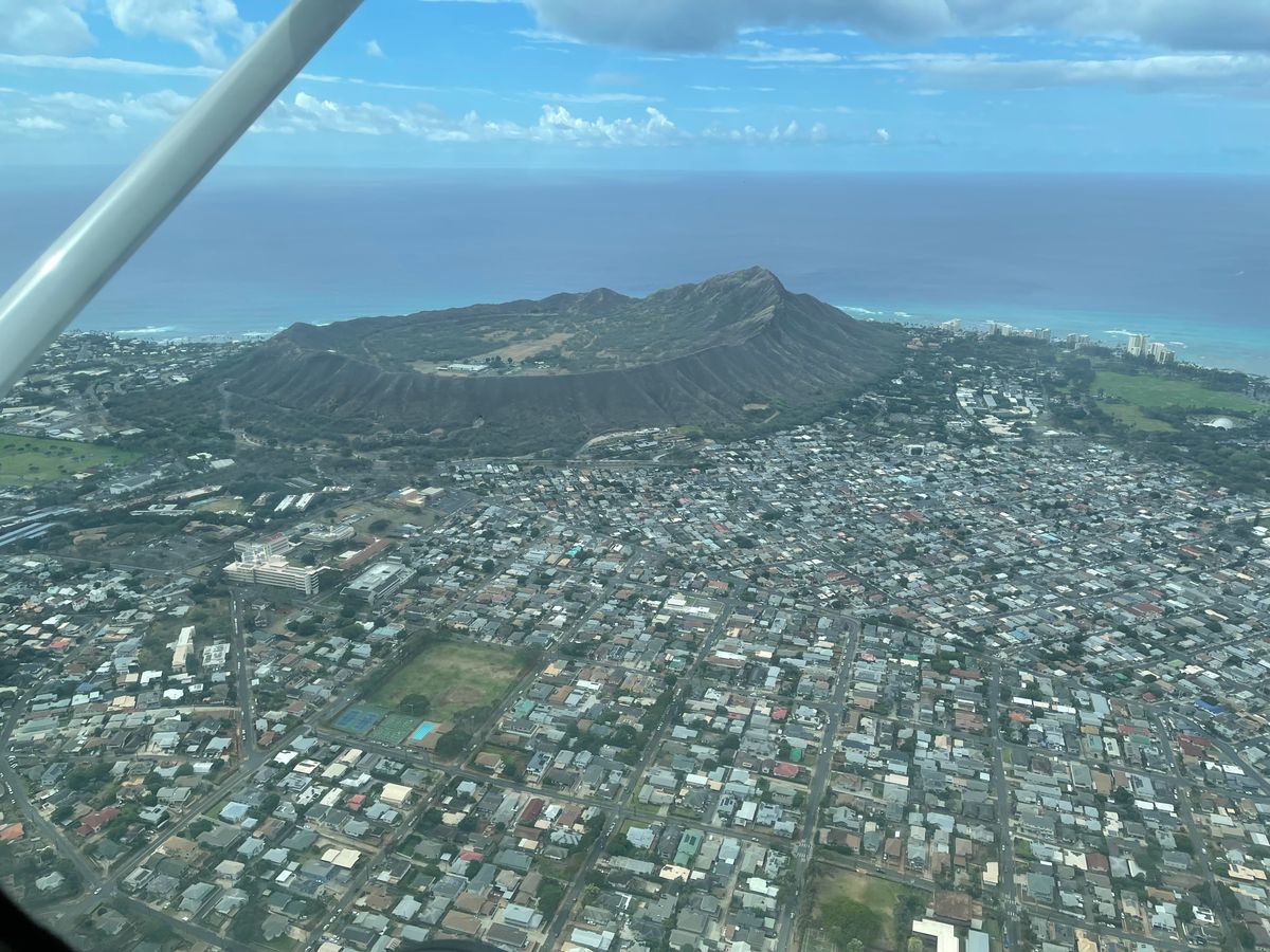 ダイヤモンドヘッドのあたりで、操縦を娘に代わります。セスナから見ると、ダイヤモンドヘッドがカルデラであることが、よく分かります。