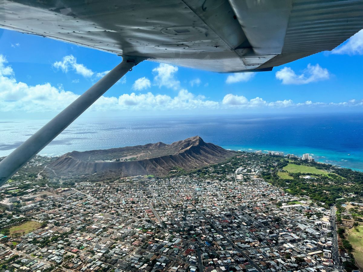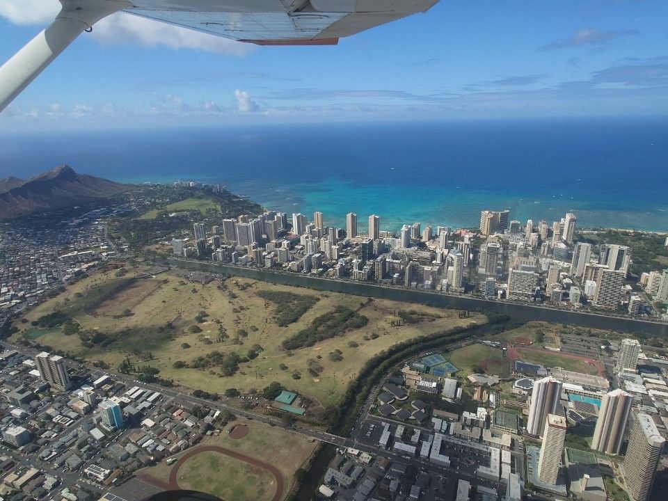 セスナで、ハワイ上空に飛び立つと、ワイキキのホテル群が一望できます。