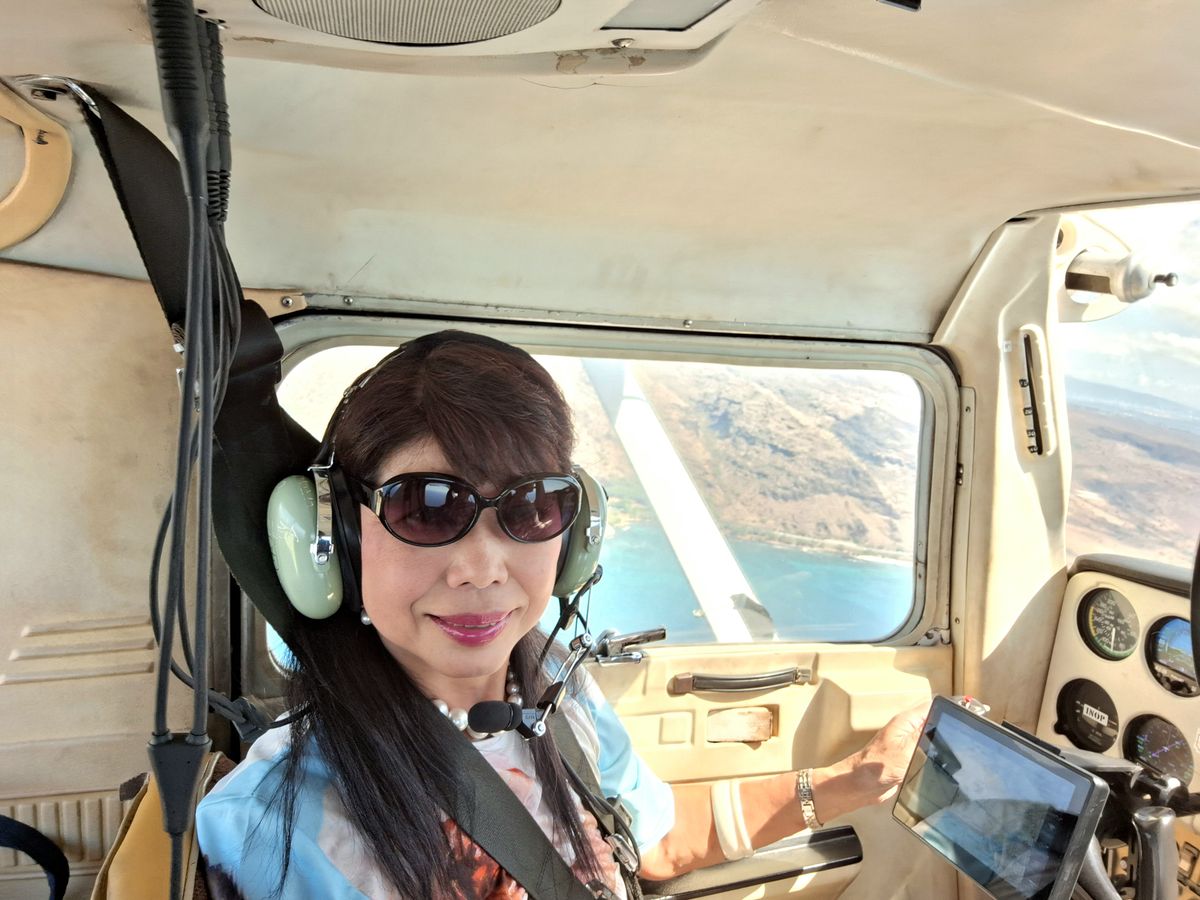 一緒に飛んでくれたパイロットはシャロンさんという女性。分かりやすい英語で会話していただき感謝。上空に上がった後,操縦桿の操作を交代して貰った。