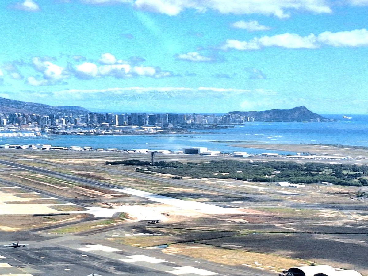 一時間の予定だったが,空港が非常に混んでおり,パールハーバーの北方で小一時間,旋回して着陸の許可待ち。こんなに長時間,許可がおりないのは滅多にないことらしい。着陸中の大型機を眼下に見ながら別の滑走路に無事着陸。