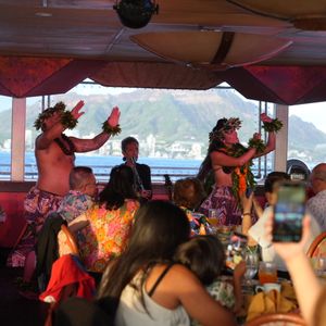 往復ともバスの送迎でしたが、シェラトンホテルの乗り場だけでも相当の人が列をなしてチェックインをしていてバスは大型バスが3台。港につくと同様のバスが何台も到着していました。船のフロアは1階〜4階まであり、3階のフロアでテーブルは窓側二人用の席が用意されていました。ディナークルーズのスタートはシャンパンから。前菜は廊下にあるテーブルに取りに行き、チーズにクラッカー、スイカやぶどうなどを席まで持ってくるスタイル。各テーブルは担当スタッフがつき、とても気持ち良い対応をしていました。3階フロアはほぼ満席で料理を配膳するだけでも大変に見えました。料理はサラダ、ロブスター、ステーキと来てデザートはケーキで終了しました。シャンパン以外に1人2枚のドリンク券がついていて好きなドリンクが無料で頼めました。海上から見るホノルルはとても綺麗で食事中も4階のデッキに行って写真を取りました。4階デッキの客室は貸し切りでデッキも前方ははなから貸切で入れませんでした。最初は入れた4階デッキも直ぐに貸し切り状態となり入れなくなりました。4階デッキは早めに昇っておくのが良いと思います。風景はホノルル市街のビル、ワイキキビーチ、ダイヤモンドヘッド、夕日の沈む光景など本当に綺麗でした。今回ヒルトンの花火を見たいということもあり金曜日のクルーズを予約しましたが、ヒルトンの花火もなかなか大掛かりなもので、船も真ん前に停止しているのでゆったりと見物できました。船を降りるときには指定されたバスの番号ごとに並んで降りますが、そのままバスに連れて行かれますのでトイレは船内で済ませておくのが良いと思います。シェラトンホテル行きのバスは途中プリンス、ヒルトンビレッジと立ち寄ってから帰りましたので少し時間がかかりました。バスの運転手もエンタティナーでした。もちろん船内で花火の後に行われたサモアのダンスや乗船客全員で踊るYMCAなどもホント楽しめました。是非お勧めしたいオプションです。