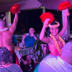 ポリネシアンダンスショーだけでも結構長いのに(おじさん達が何回も着替えて何曲も踊る)、更にその後は昔のディスコ風参加型ダンス大会。