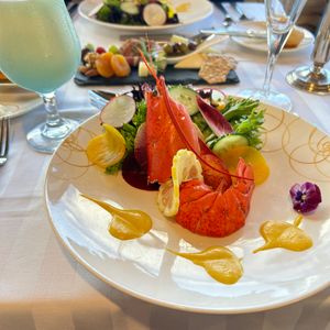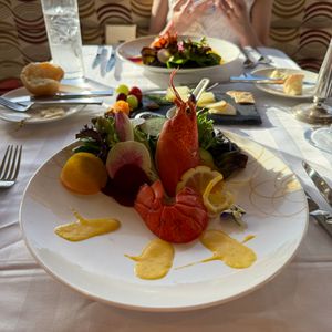 最初から置いてあったサラダを食べ、外の通路にあった、食べ放題のチーズとフルーツを食べ、ロブスターが出てきました。