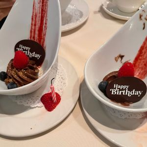 ウェブ予約の時に誕生日祝いの利用と入力したのですが、お店の受付でどっちが誕生日なの?と聞かれ、2人ともだよと伝えるとデザート提供のタイミングで写真ノチョコムースを人数分、サプライズでサービスしてくださいました!
