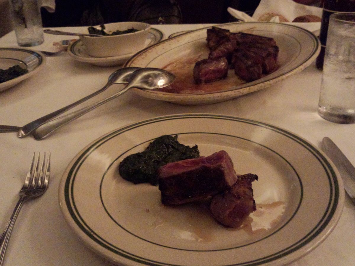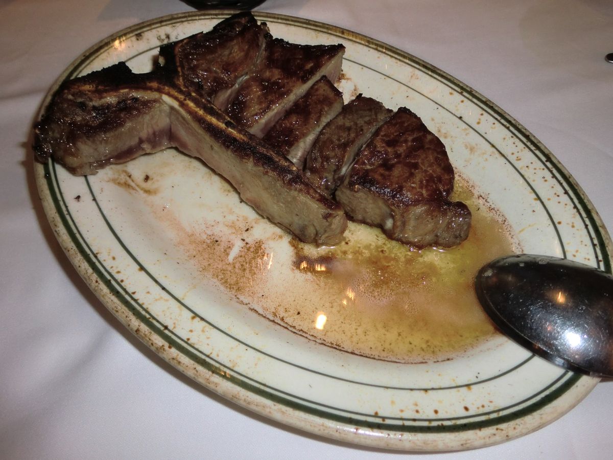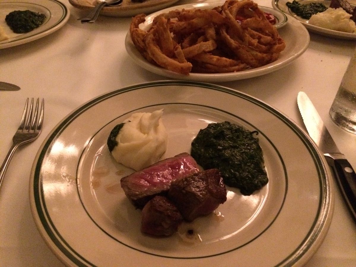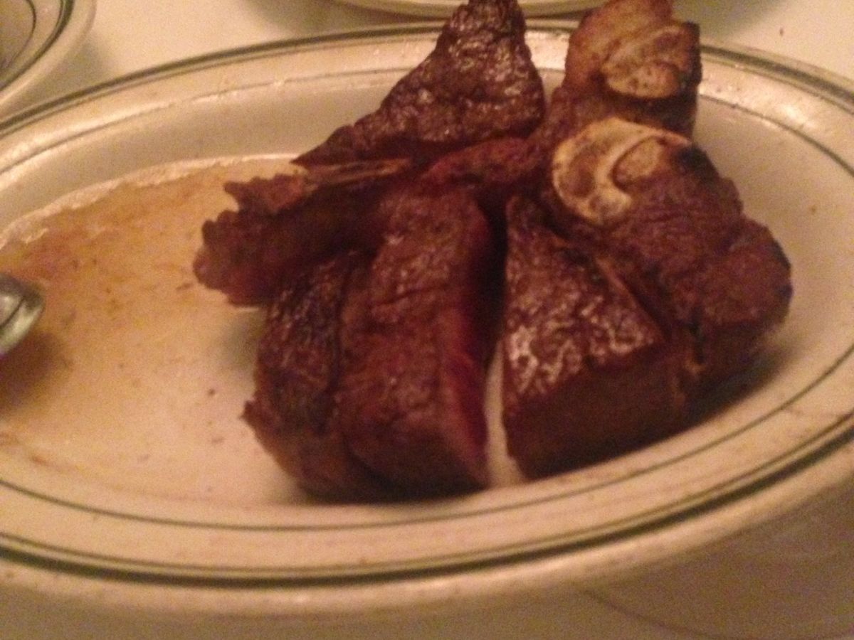 スタンダードディナーを予約して行きました。名物のポーターハウスステーキの方がいいか迷いましたが、結果はスタンダードで、正解でした。周りに、食べきれなかった他のテーブルの、山のように残ったお肉を見たら悲しくなりました。スタンダードのフィレステーキでも、多分300gぐらいあるような大きさで、焼き加減もレアでちょうど良く、本当に美味しくお腹いっぱいになりました。お肉が良いので、塩と胡椒だけで最後まで頂きました。ステーキソースなど、使わない方がお肉の美味しさが活きると感じました。前菜の牡蠣、付け合わせのホウレンソウ、マッシュポテトもとても美味しいです。ただ、なぜかコーヒーの後に!!!野菜の沢山入ったミネストローネが出て来て、デザートのケーキとスープという、ヘンなテーブルの景色になり、夫が、「なぜ今頃スープなんだ?」とクレームを付けました。どうやら忘れられていたようで・・・もう、その時点ではお腹がポンポンで、とてもスープは無理・・ちょっと味見したら、スープも美味だったので、あ~飲みたかったな~・・と、悔いが残りました。