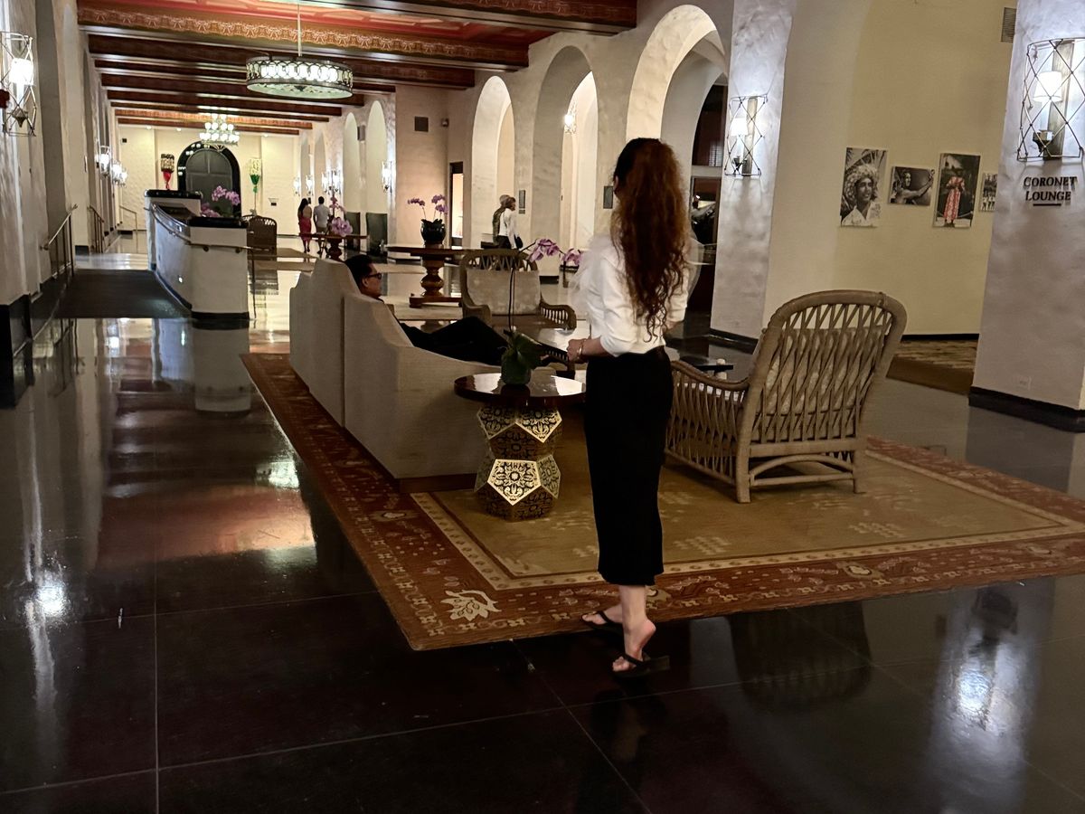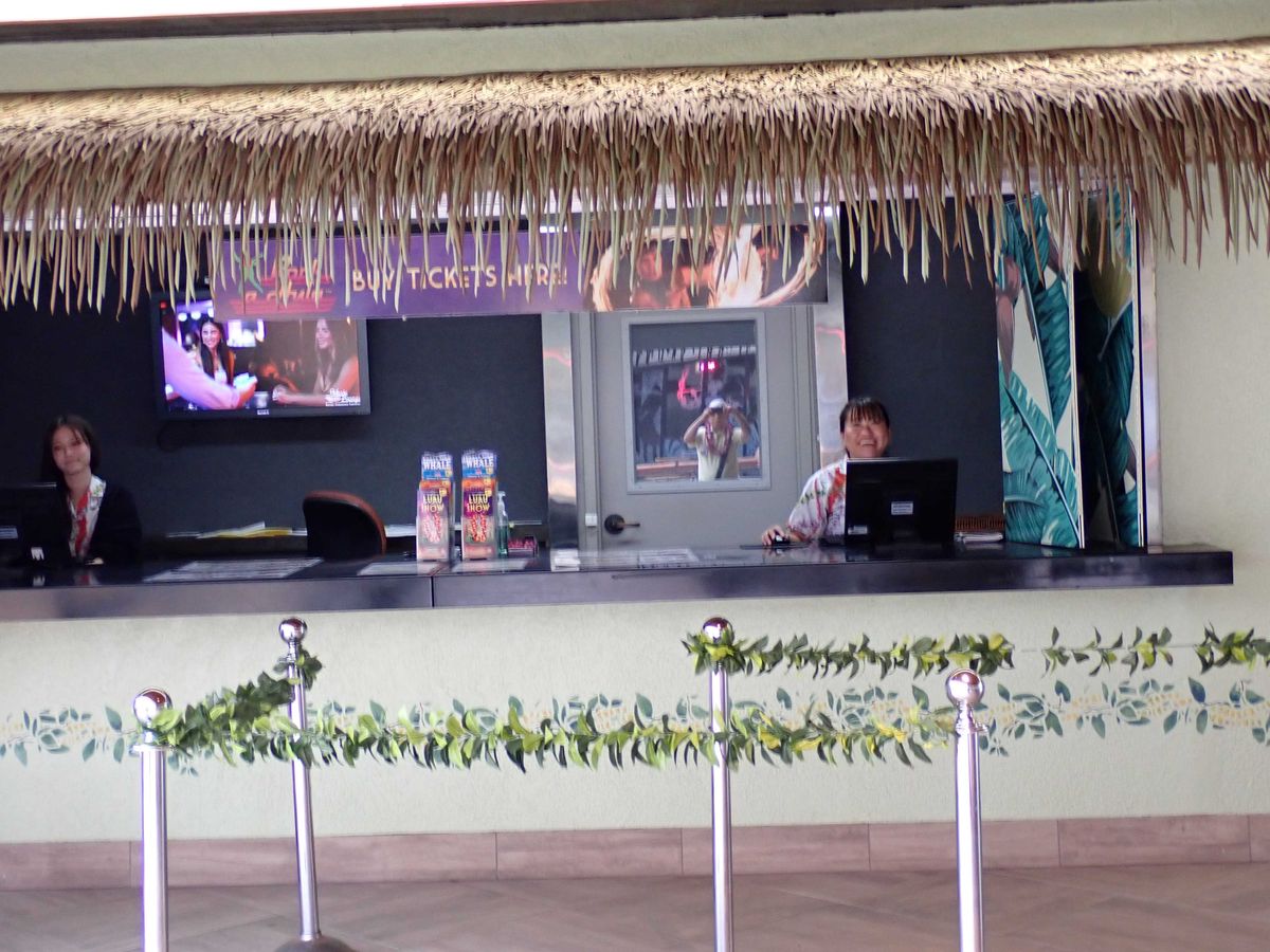 ロイヤルハワイアンセンターのB棟の向かって左側の端っこにエレベーターが有り4F ロッックアフラショーと明記されていた。エレベーターから降りると受付(写真1)があり、お姉さん(写真2、VIPの世話役、バックステージの案内役、踊り担当)がプリメリアのレイをかけてくれた。帰りはロイヤルハワイアンセンターのA棟(新しく出来たDior)側の端っこから1Fまでエスカレーターで降りられた。
