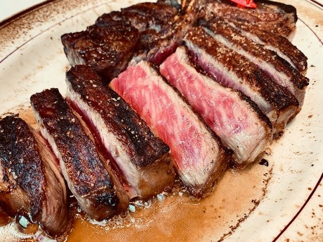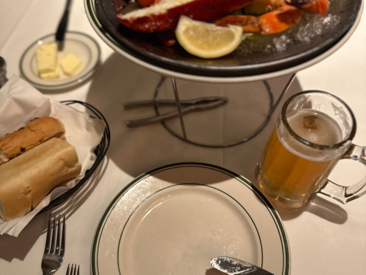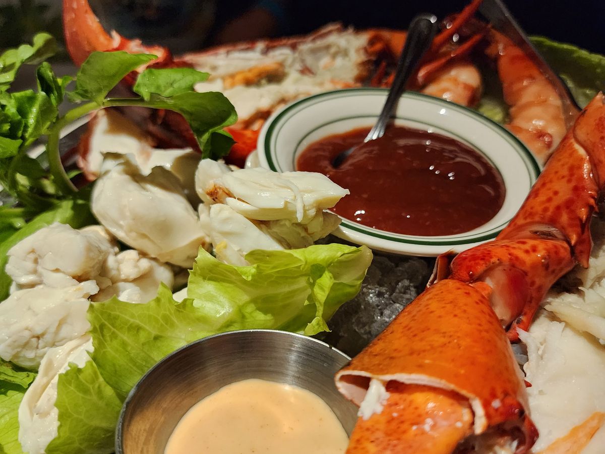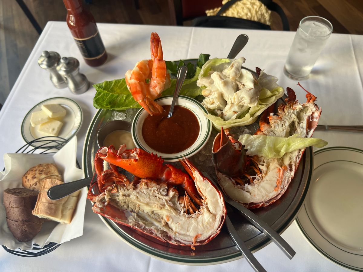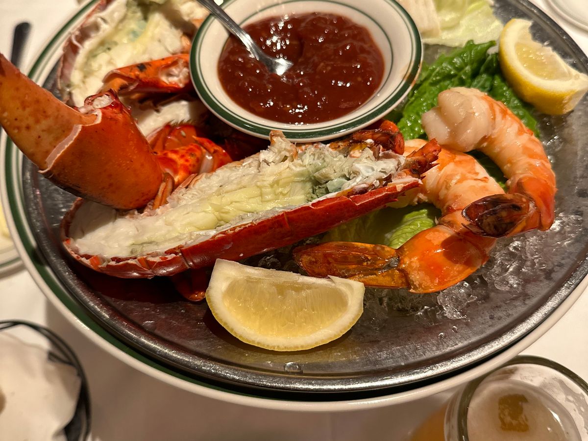 円安で厳しかったですが、Tボーンステーキは絶品で、付け合わせのほうれん草ソテーとマッシュドポテトもおいしかったです。最初に来るカニ、オマール海老、エビも見た目が華やかで豪華でした。