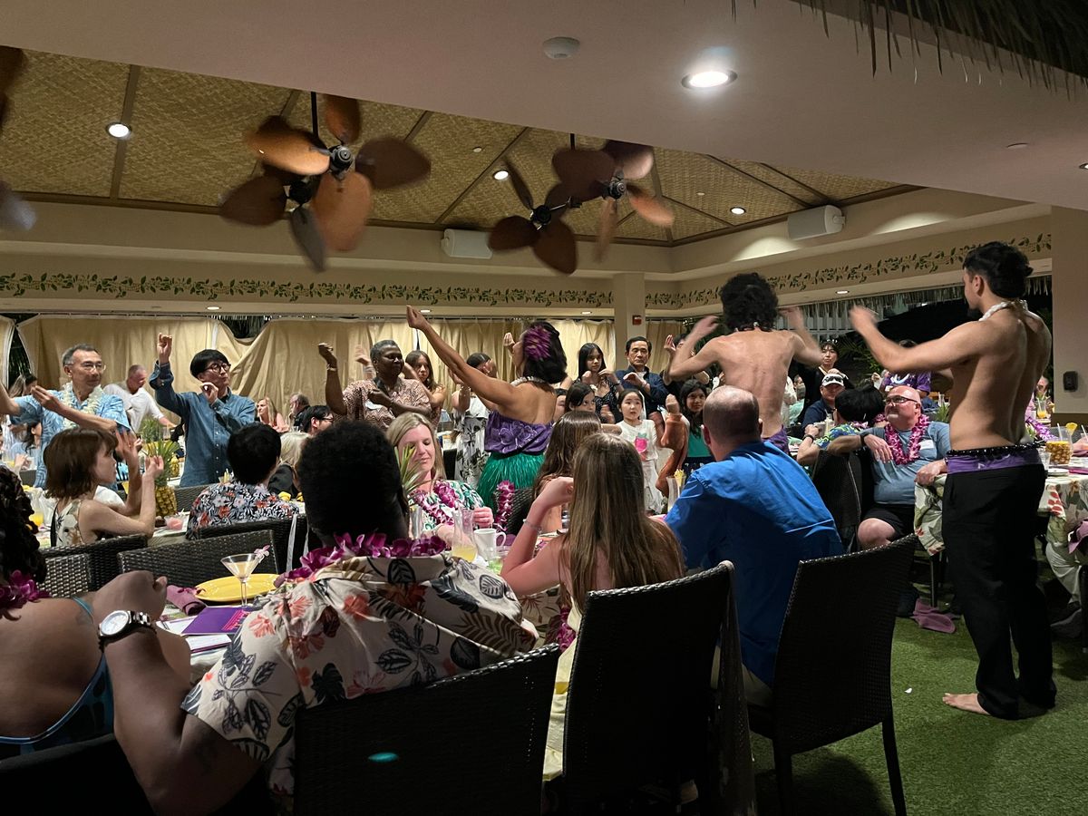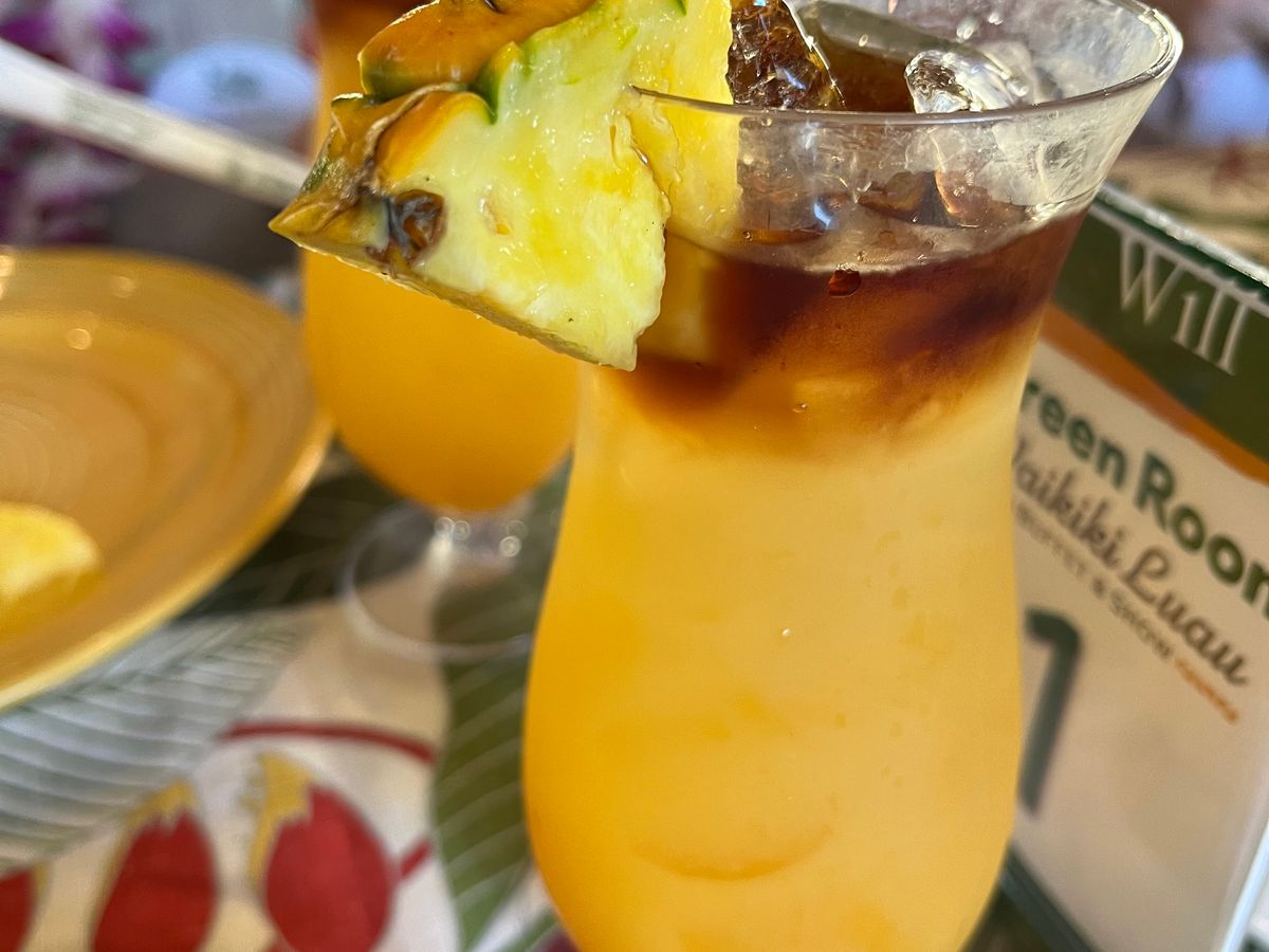 到着次第レイとマイタイをもらい、フラダンスを眺めながら美味しいビュッフェをいただきました。