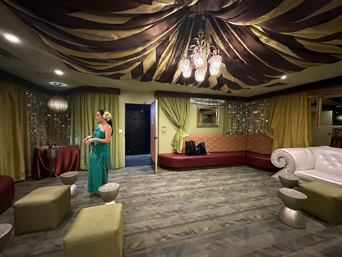 前回行ったときはロッックアフラショーのエントランス付近で踊って迎入れてくれたが今回はなし、グリーンルームは変わっていなかった。シャンパンとおつまみ(写真3)、写真撮影で終わり。その後のバックステージツアー(写真4)も変わらず。変わったのは、食事の方法。以前は館内の前方に四角いテーブルがあり、食材はすべて持ってきてくれていた。食事なしの普通席は段差のある2Fだった。今回会場(写真5)の中は、すべて階段席に変わっていた。