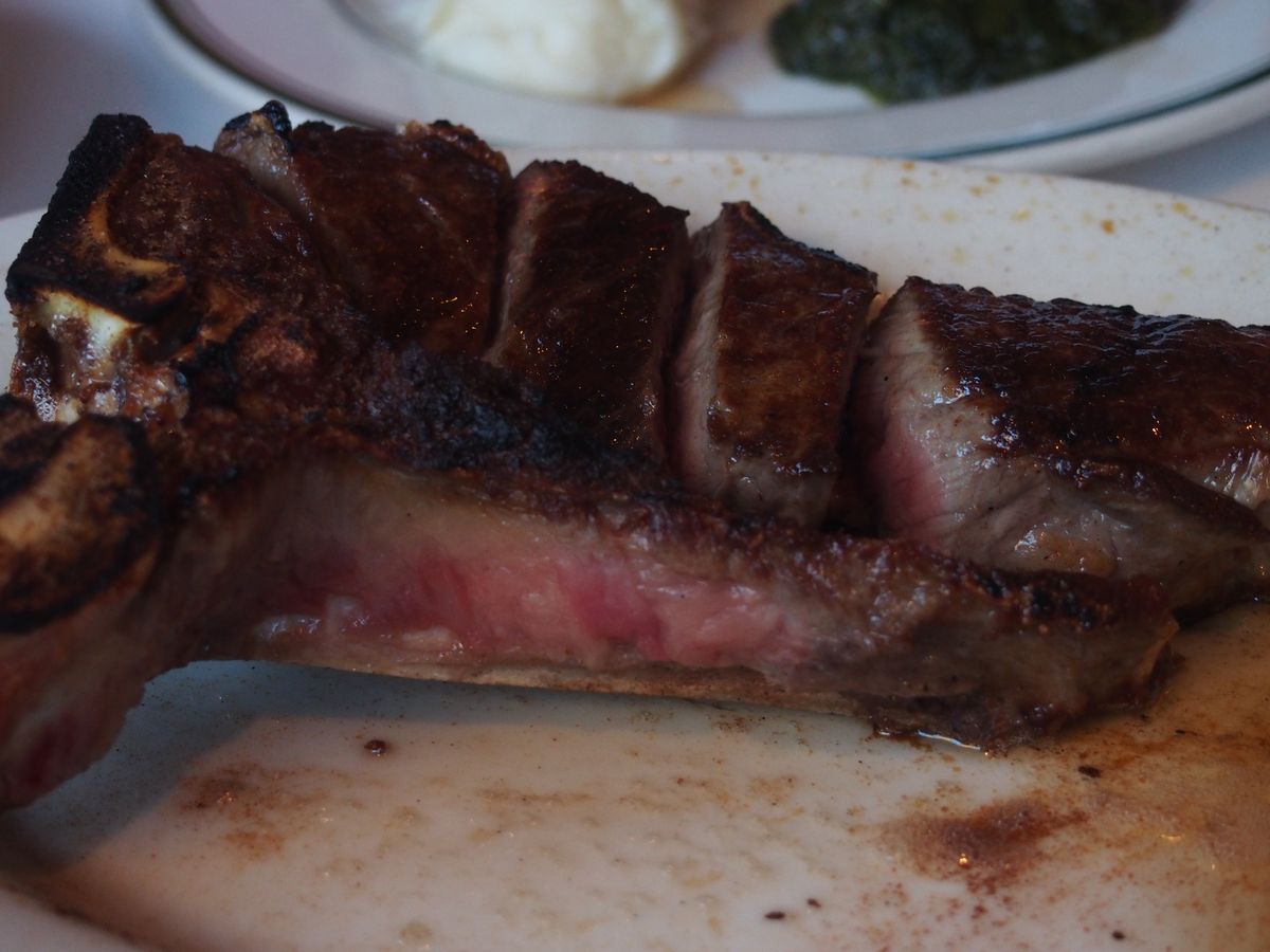 ウルフギャングステーキに行きました。日本で事前に予約していたおかげで、店前には待つているお客でいっぱいでしたが、入店までスムーズでした。一歳の子連れでしたが、ハイチェアーを用意してもらいました。料理はコースで、ロブスターと蟹の前菜、ほうれん草とマッシュドポテトのサイドメニューと、パン、28日間熟成ステーキ、デザートにケーキと紅茶、コーヒー。豪快さはさすがです。